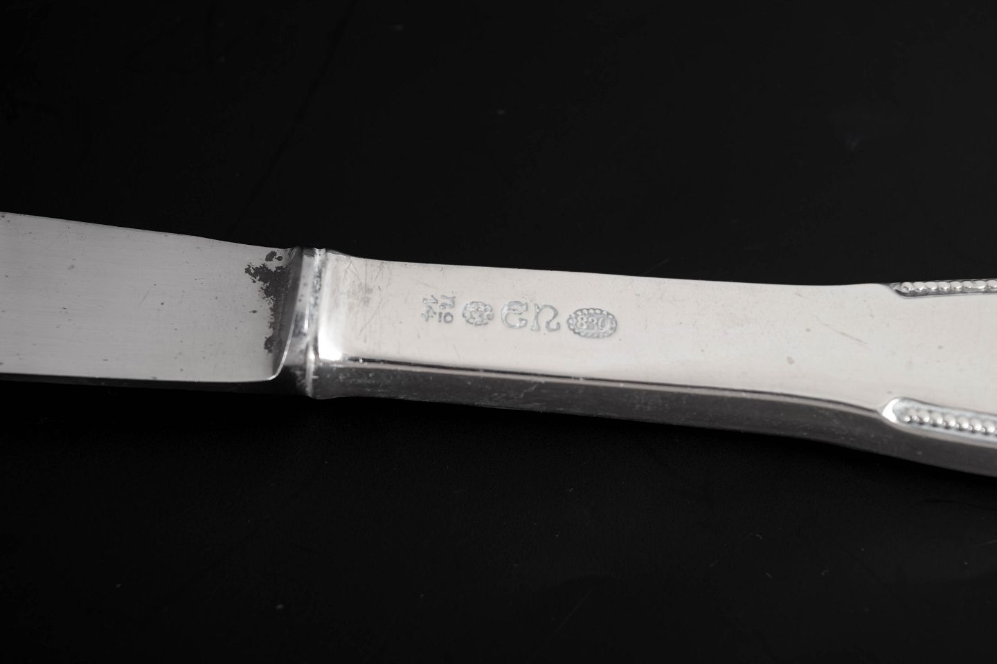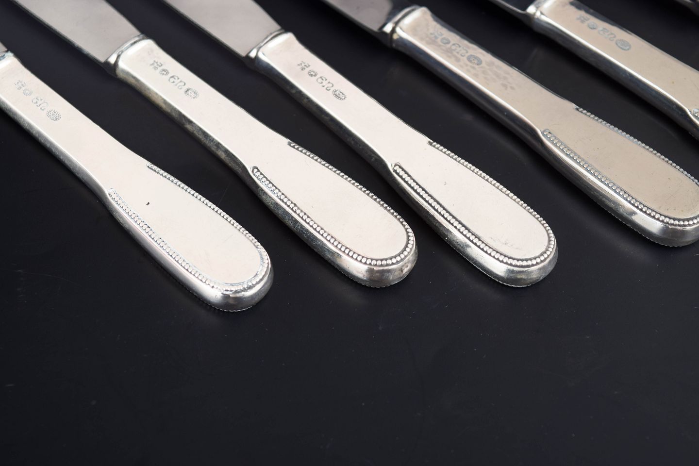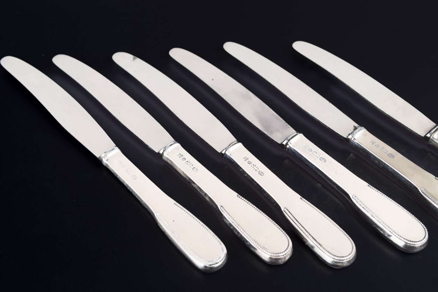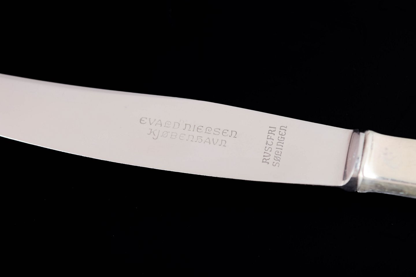 Elegante frokostknive i tretårnet sølv og rustfrit stål. Model nummer 14 med klassisk, let afrundet skaftform med diskret perlekant og glat klinge. Fremstillet hos Evald Nielsen.