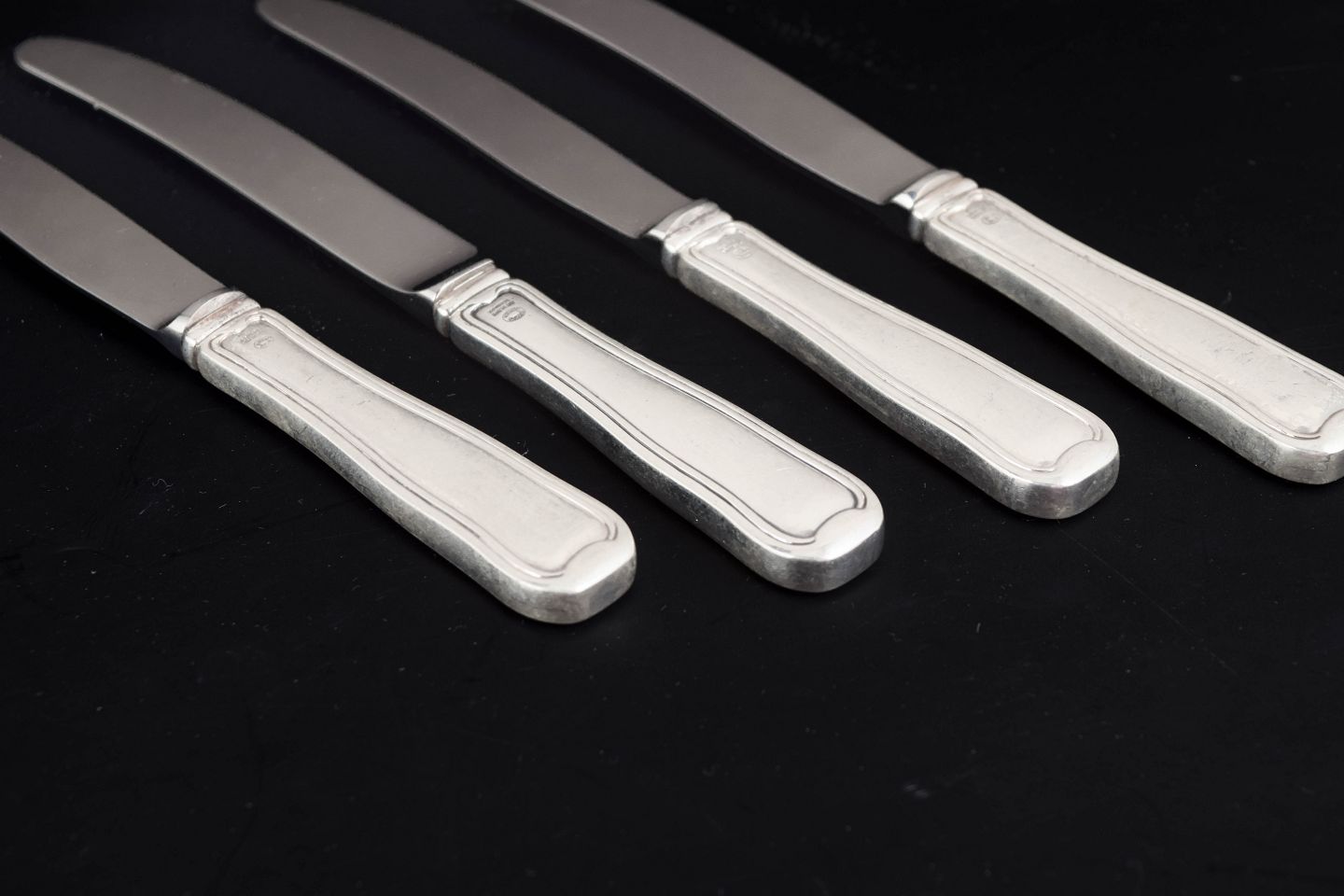 Sæt af fire frugtknive i rustfrit stål og sterlingsølv med skaft i mønstret Dobbeltriflet. Knivene har slanke blade i rustfrit stål og elegante sølvskaft med de karakteristiske parallelle rifler langs kanten, et klassisk design fra Georg Jensen.