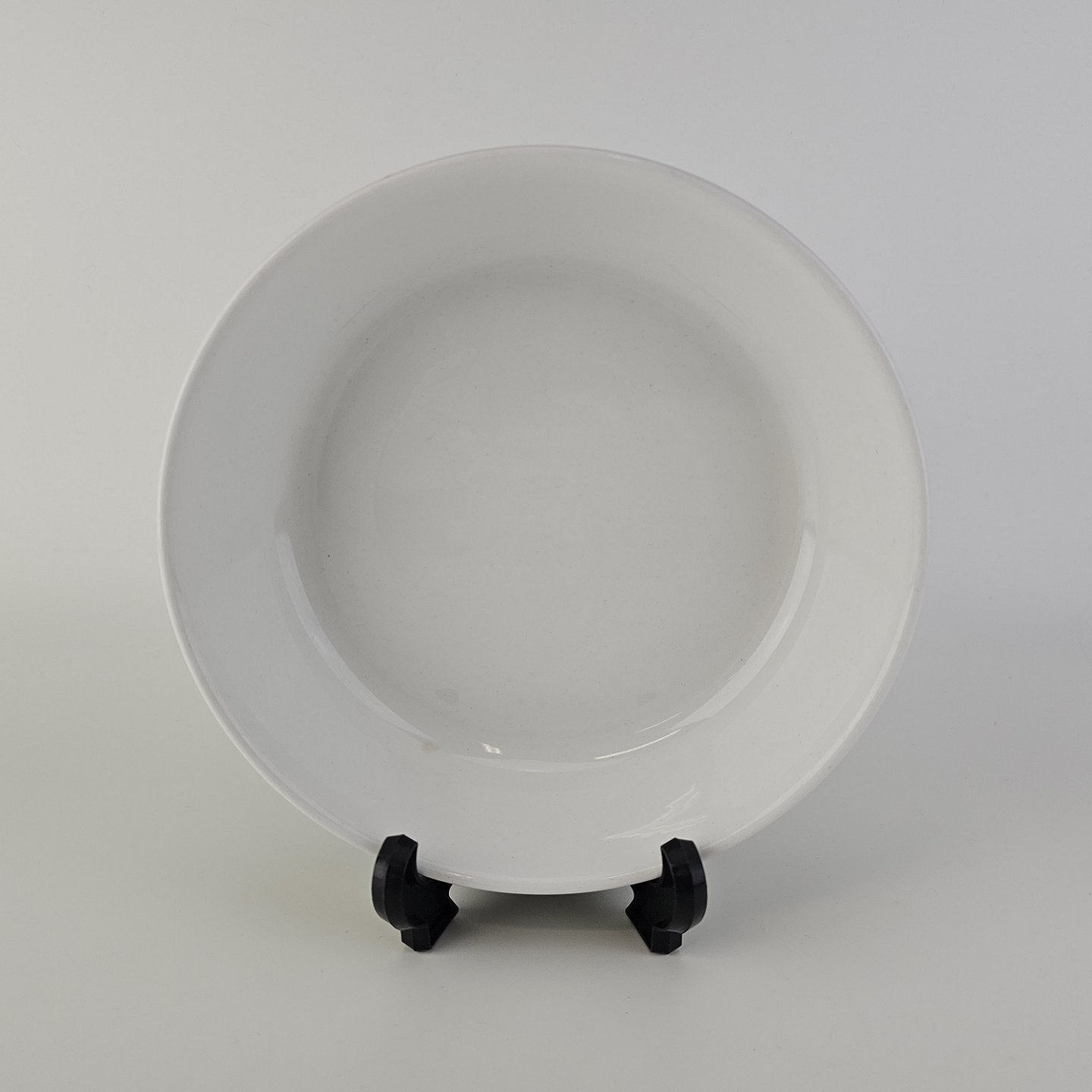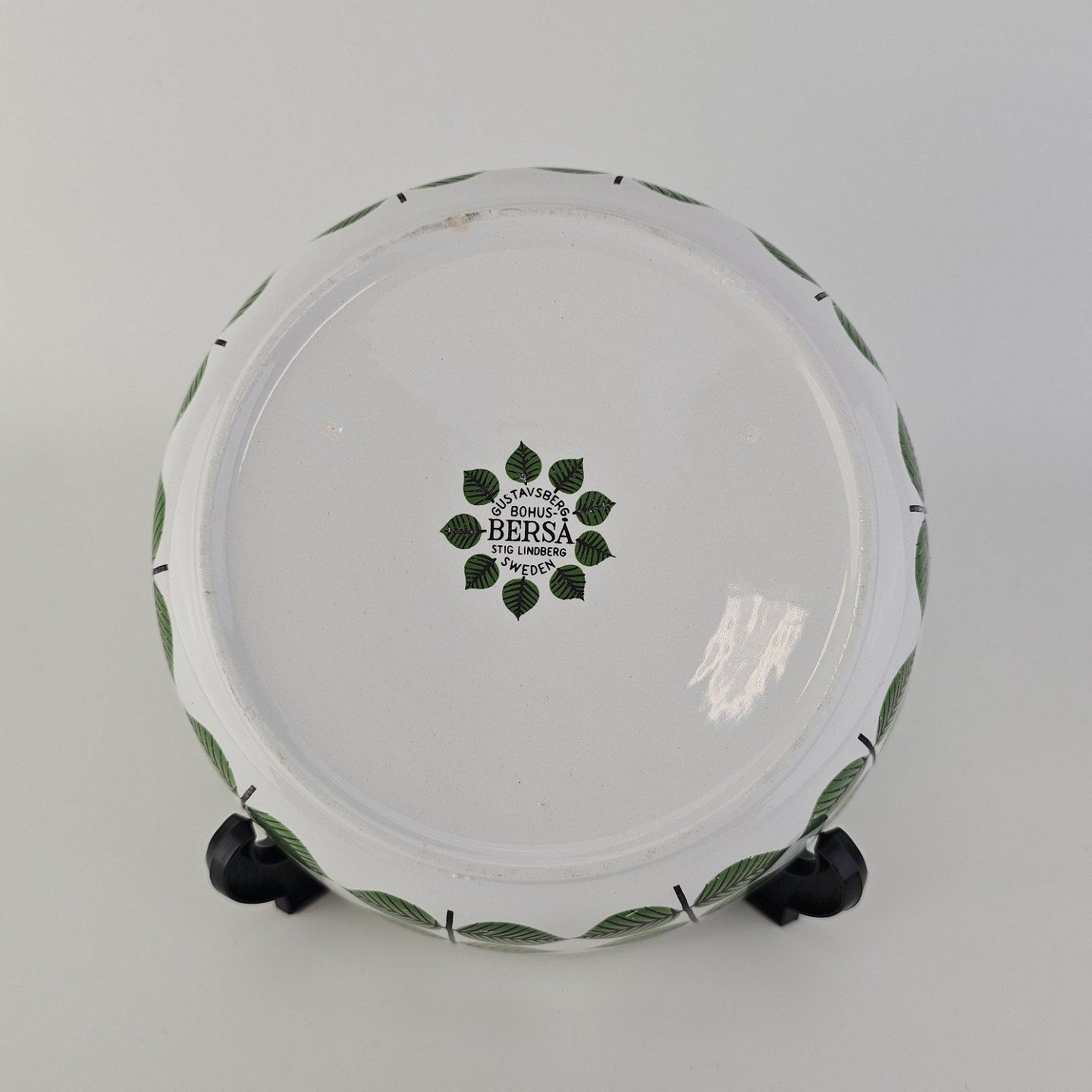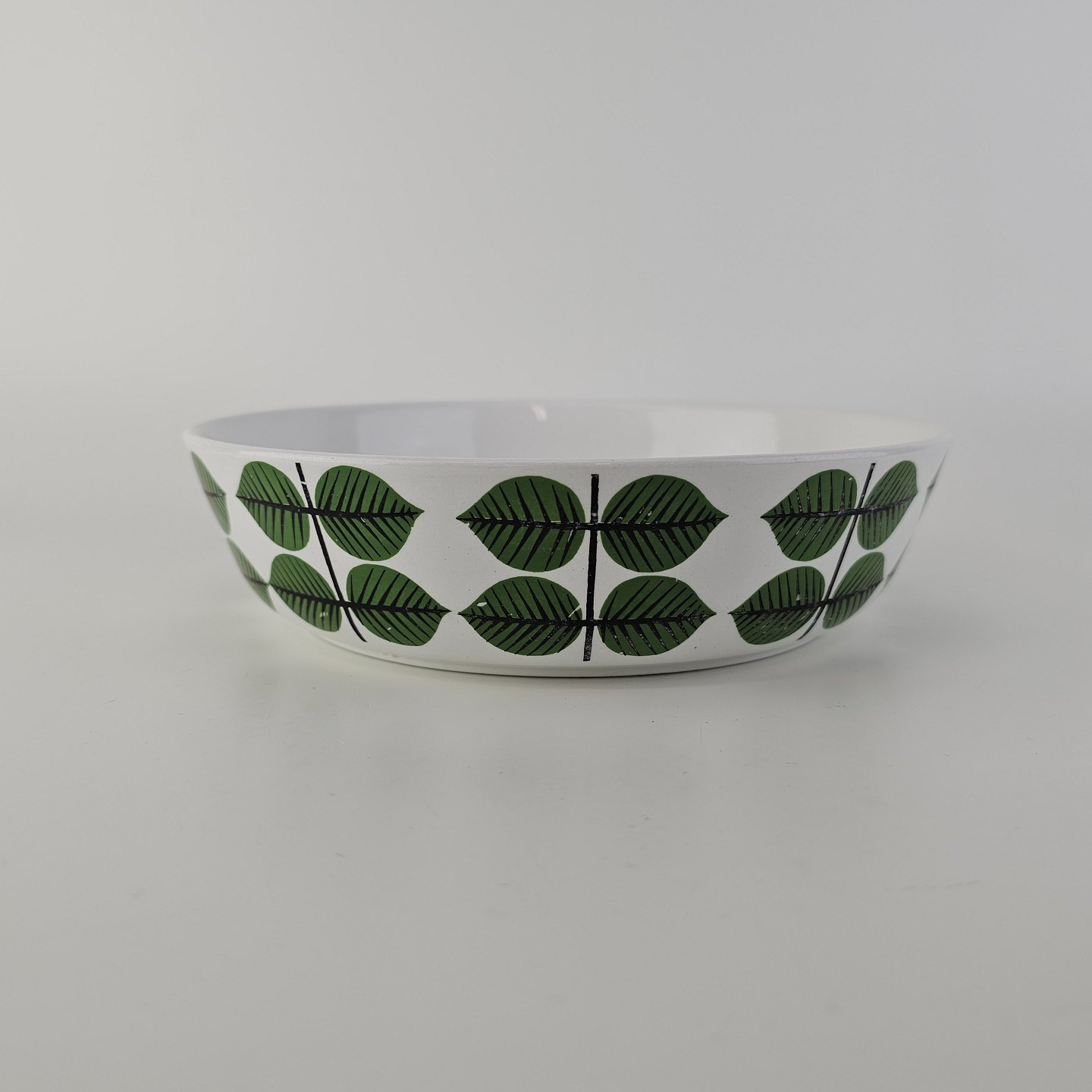 Stel i hvidt porcelæn med dekoration af grønne blade.