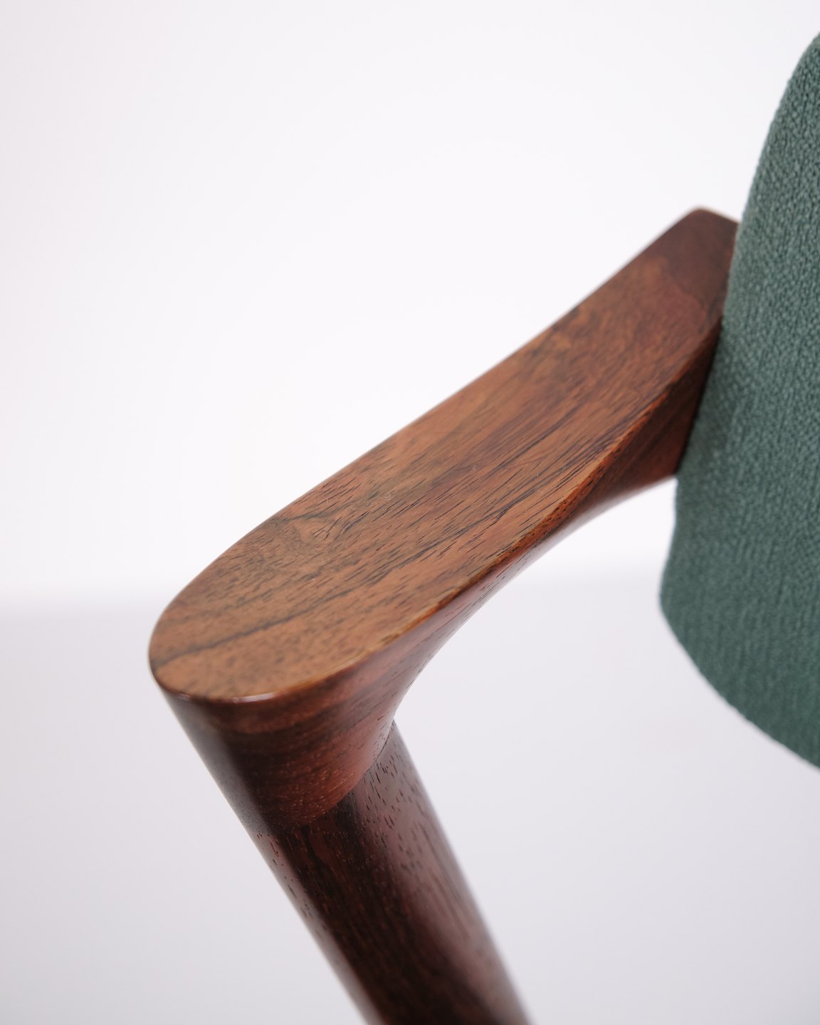 Sæt spisebordsstole, model 42, designet af Kai Kristiansen i 1960’erne. Stolene er udført i palisander og er kendetegnet ved deres elegante proportioner, skulpturelle ryg og karakteristiske danske snedkerdetaljer. Model 42 er et markant eksempel på dansk møbeldesign fra midten af det 20. århundrede.