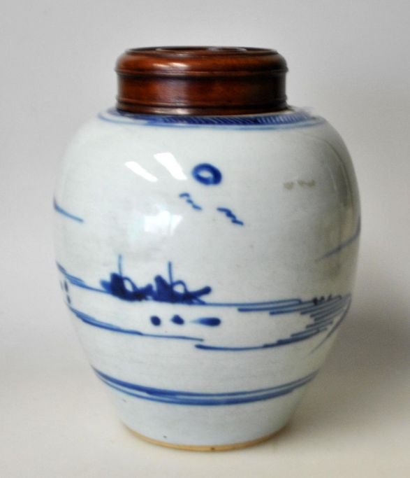 Kinesisk porcelæns bojan, 19. årh. Med blålige håndmalede landskabsdekorationer. Med trælåg. Højde med låg: 15 cm.