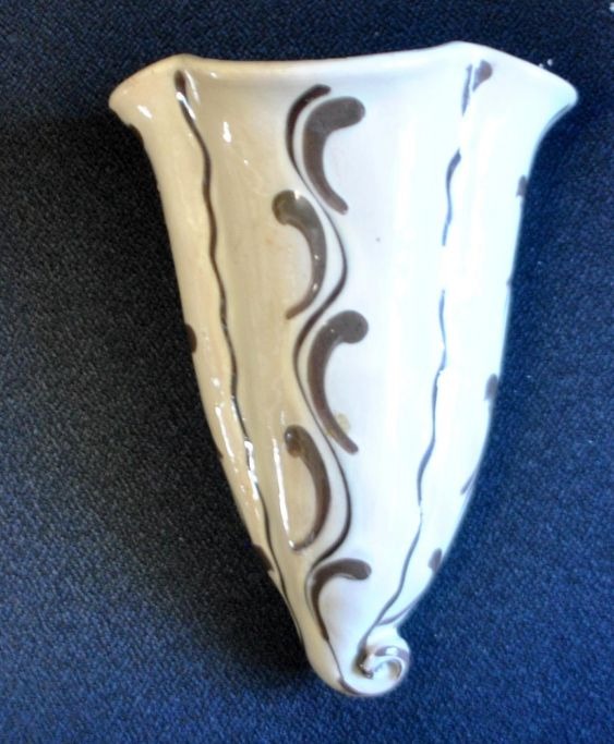 Herman A. Kähler vægvase, o. 1930. Næstved, Danmark. Cremefarvet glasur med brune mønstre Højde.: 17,5 cm. B.: 13 cm. Signeret.: HAK og DANMARK.