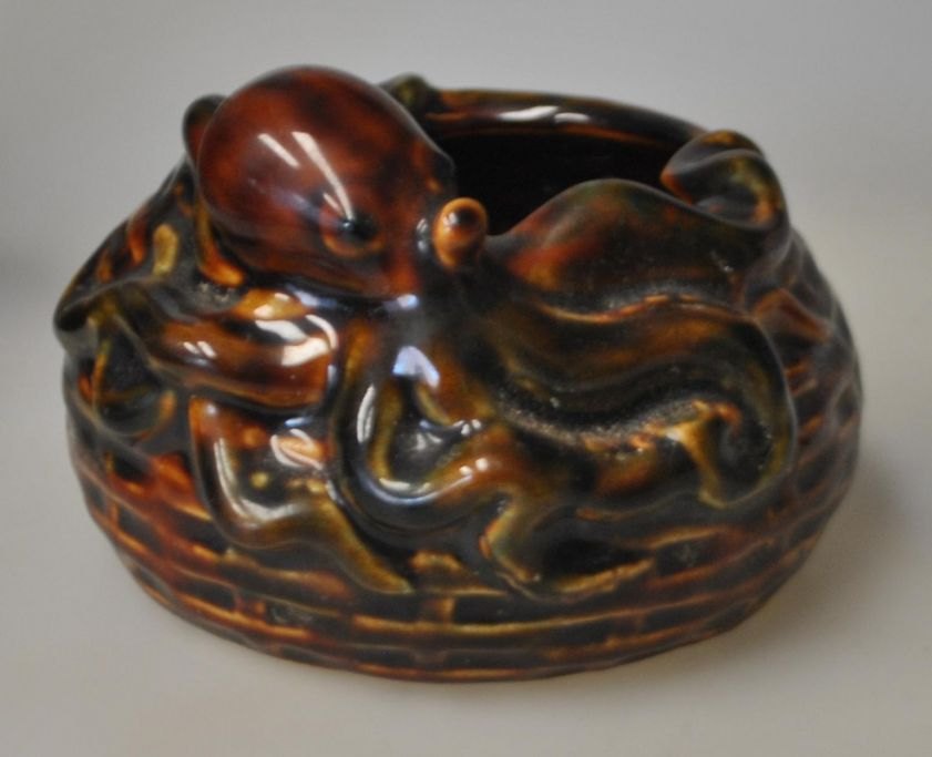Fajance skål, ca. 1900. Brunglaseret. Dekoreret med en blæksprutte ved en kurv. H.: 7,5 cm. Dia.: 12,5 cm.