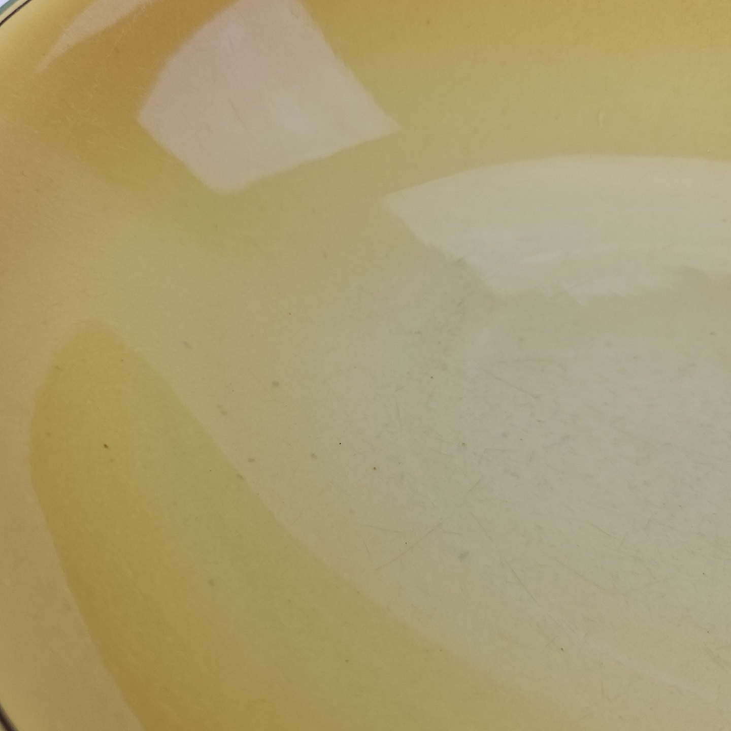 Fajancestel i stelform C med dekoration i gule nuancer med grøn stribe.
