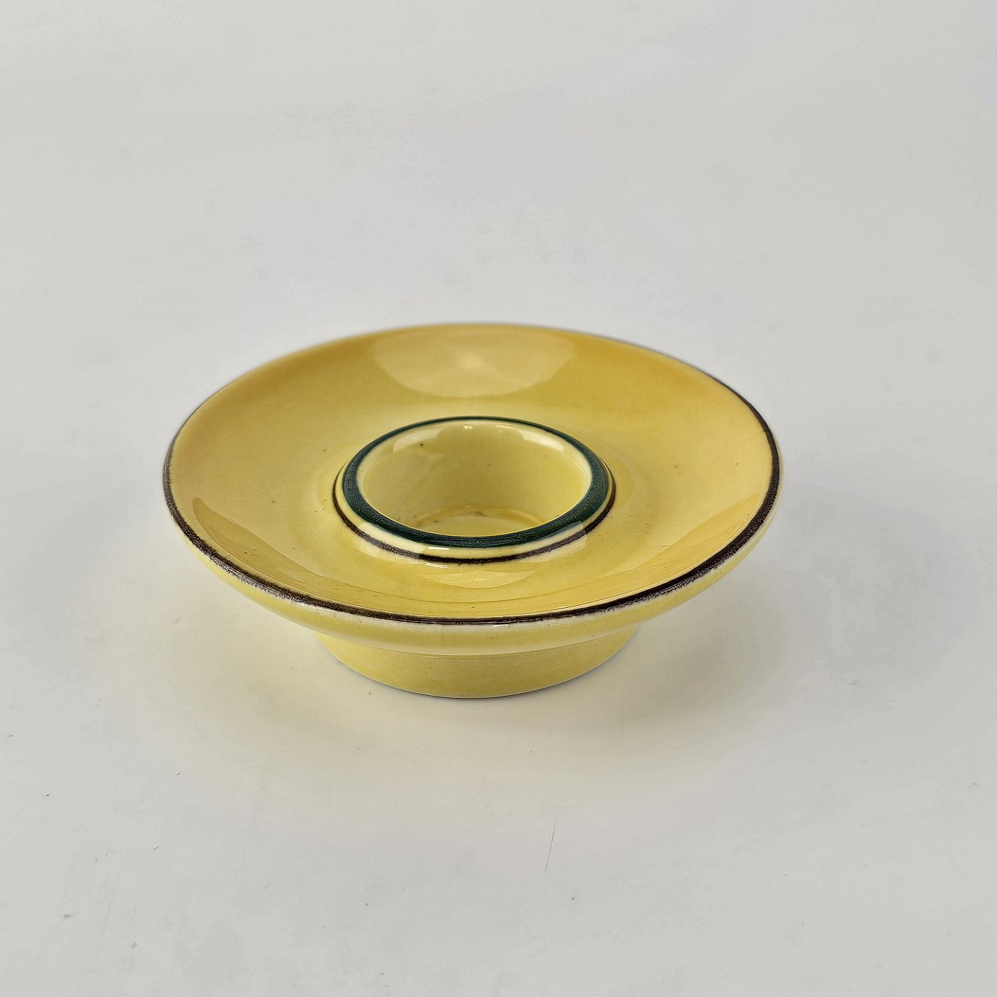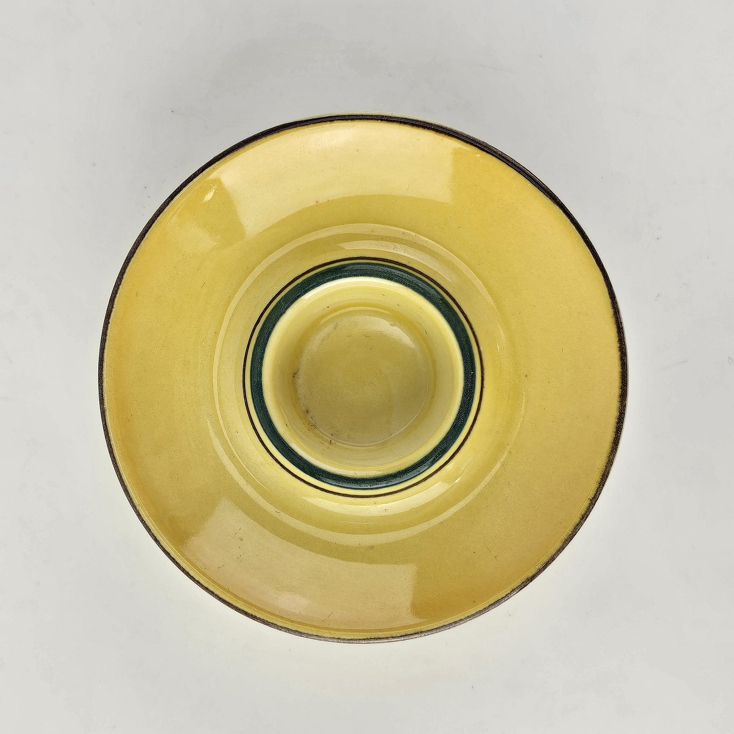 Fajancestel i stelform C med dekoration i gule nuancer med grøn stribe.
