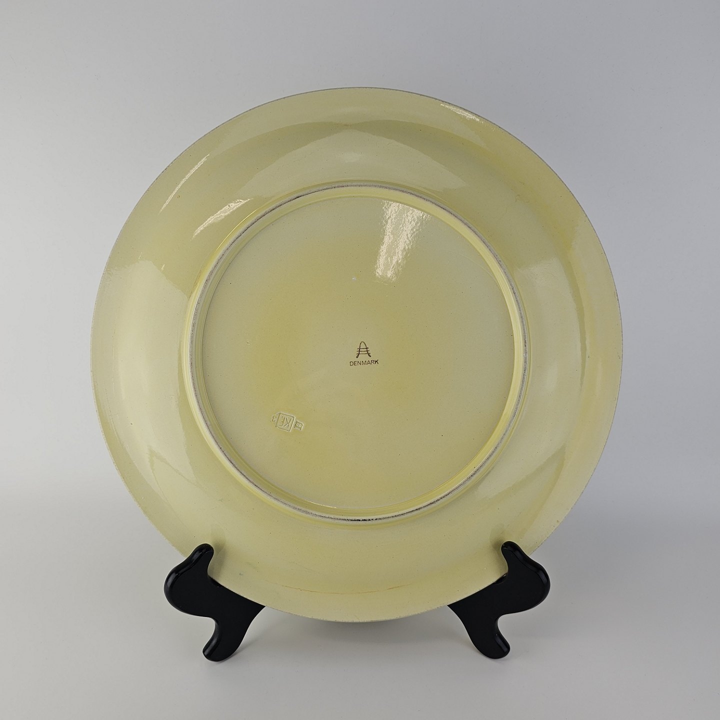 Rundt fladt fad i fajance fra stellet Gertrud fremstillet i perioden 1933-1939.