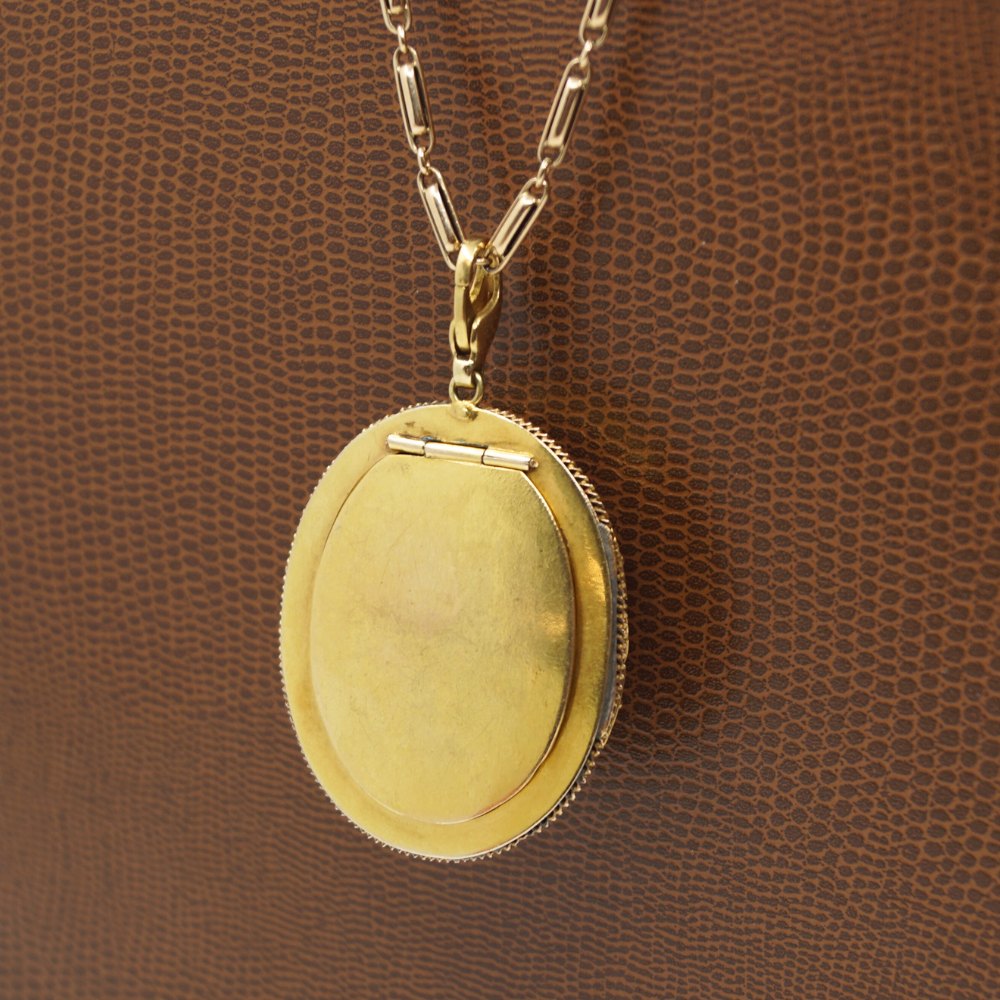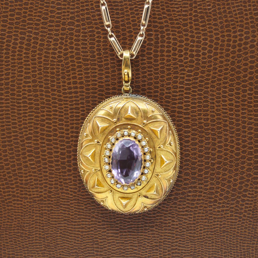 Medaljon i 14 kt. guld med ametyst, omkranset af små perler.