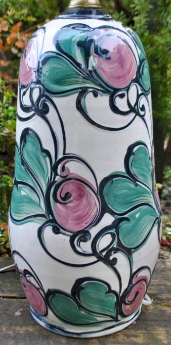 Bordlampe fra Hornbæk Keramik, 20. Årh. Danmark. Glasur i hvid, sort, grøn og rosa. Stemplet: HK. H: 58 cm. Dia: 16 cm.