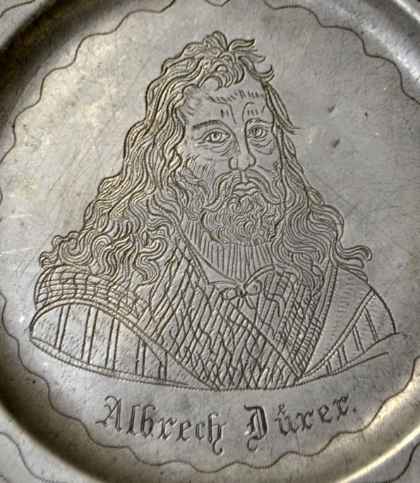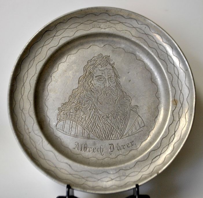 Tin tallerken med Albrecht Dürer, 19. årh. Tyskland.