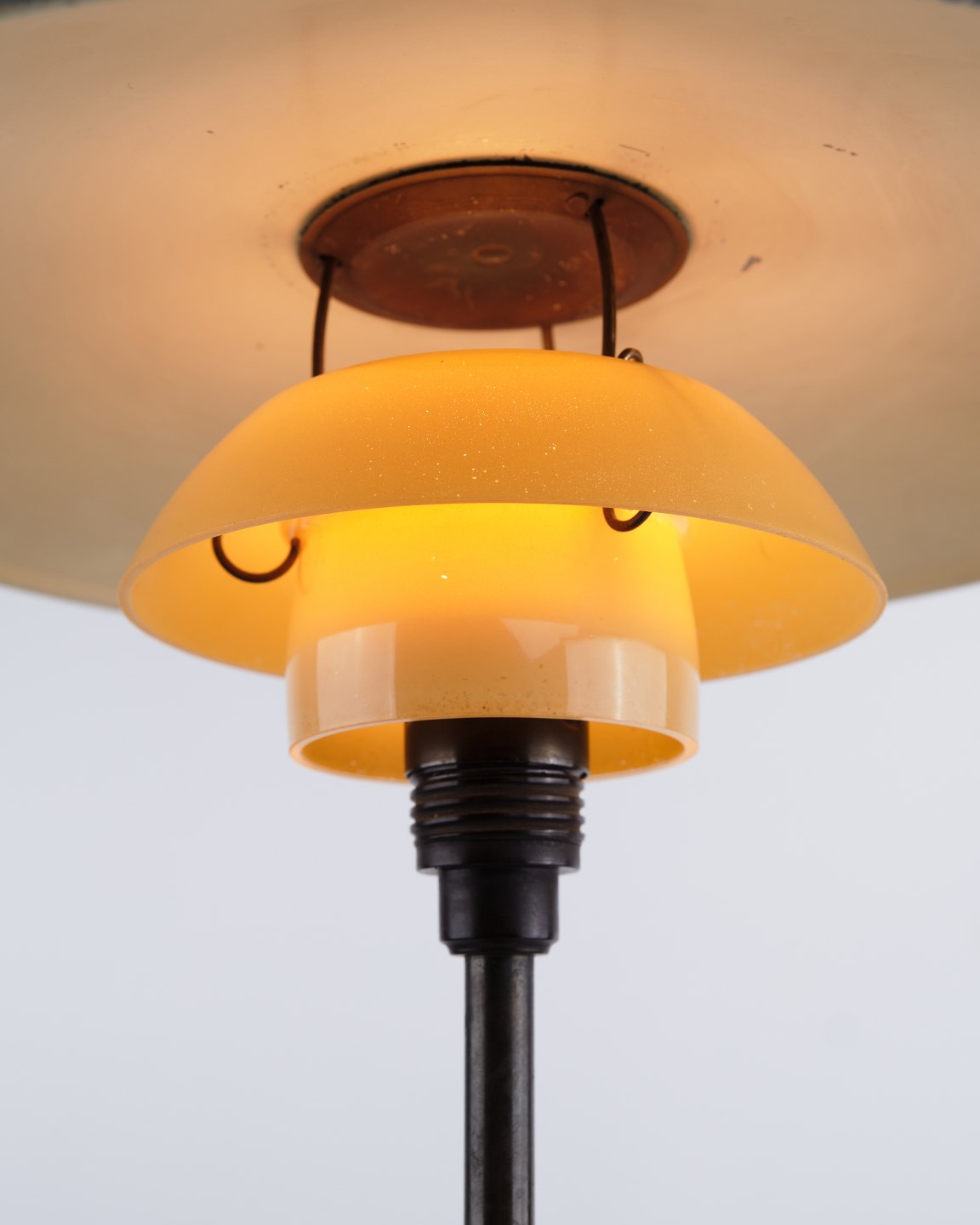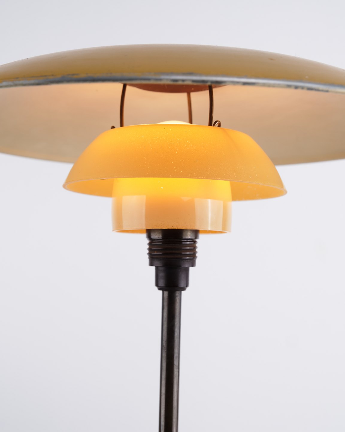 Sjælden PH 3,5/2,5 bordlampe designet af Poul Henningsen og fremstillet af Louis Poulsen i 1930’erne. Lampen har gulmalet metaloverskærm med stel i bruneret messing samt mellem- og bundskærme i 1-lags gulmalet opalglas.