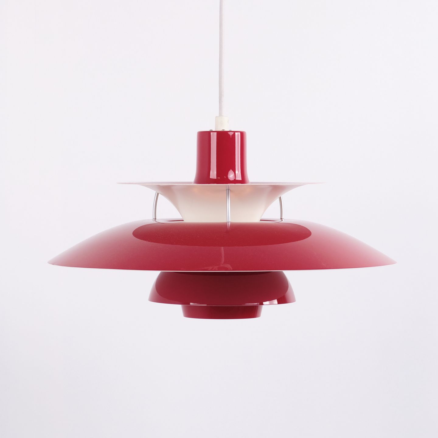 PH 5 pendel i rødlakeret metal fra Louis Poulsen designet af Poul Henningsen. Klassisk dansk lampe med blændfrit og funktionelt lys.