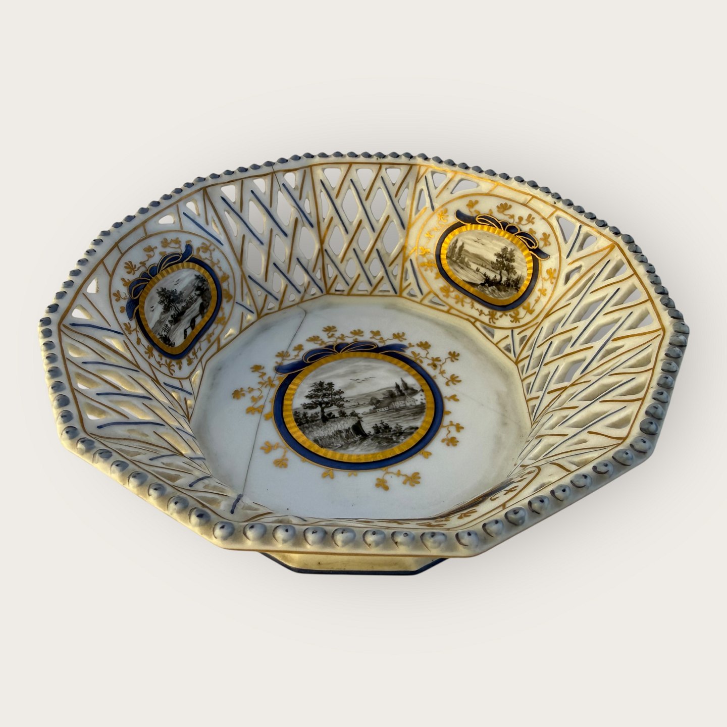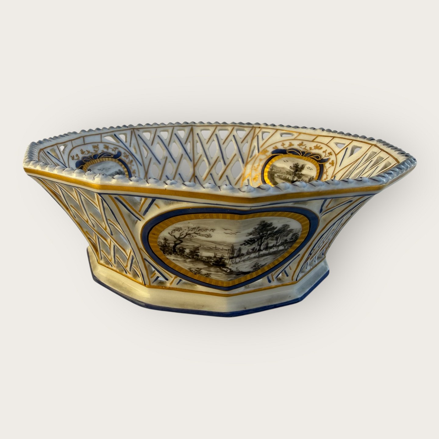 Nymphenburg porcelæn, to retikulerede skåle (gennembrudt gittermønster i kanten), med håndmalede landskabsmotiver, den ene skål med revne i bunden ( se foto) ellers fin stand, Hver skål måler ca. 5x14cm.