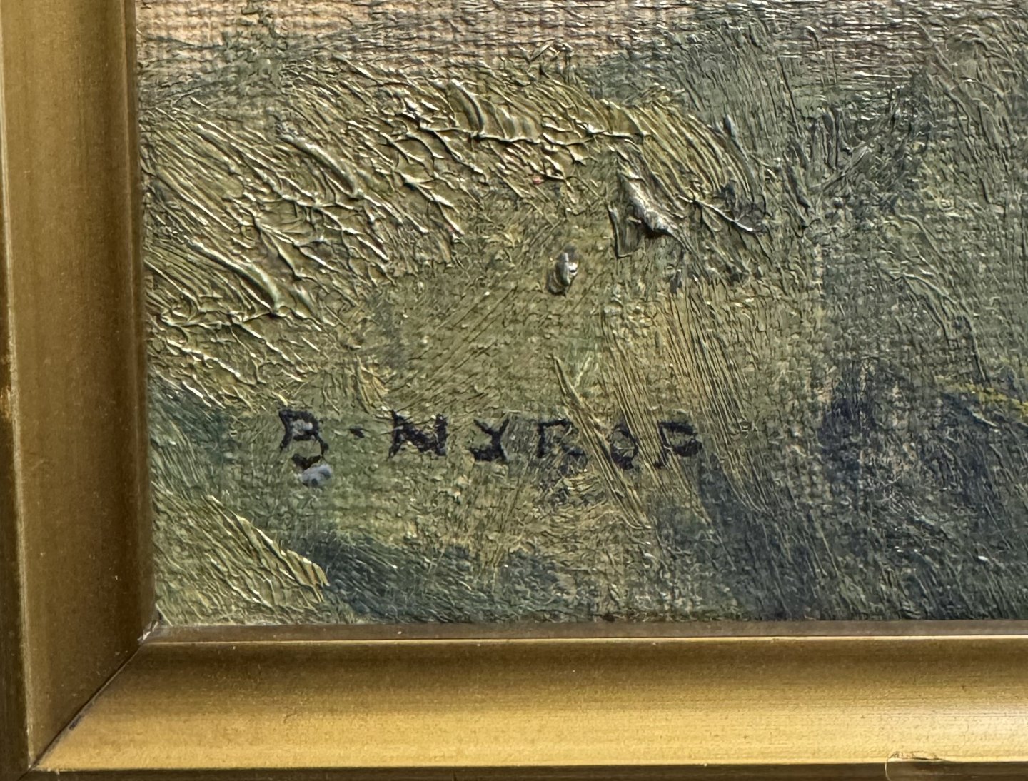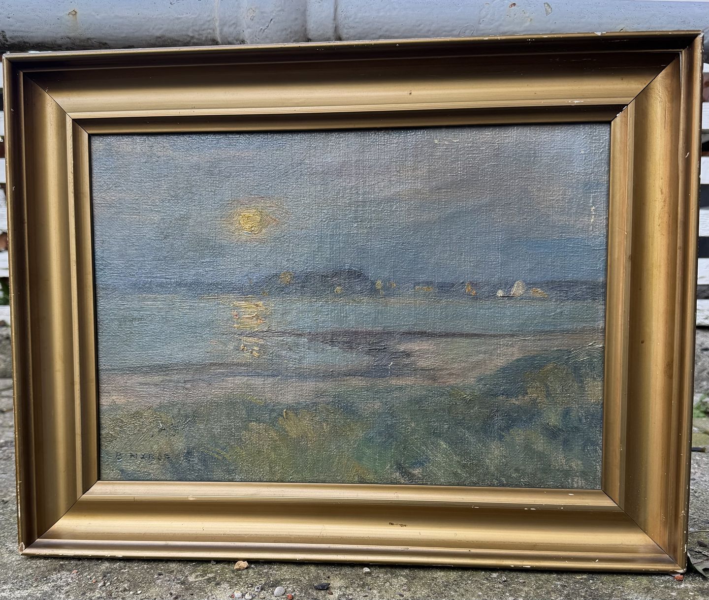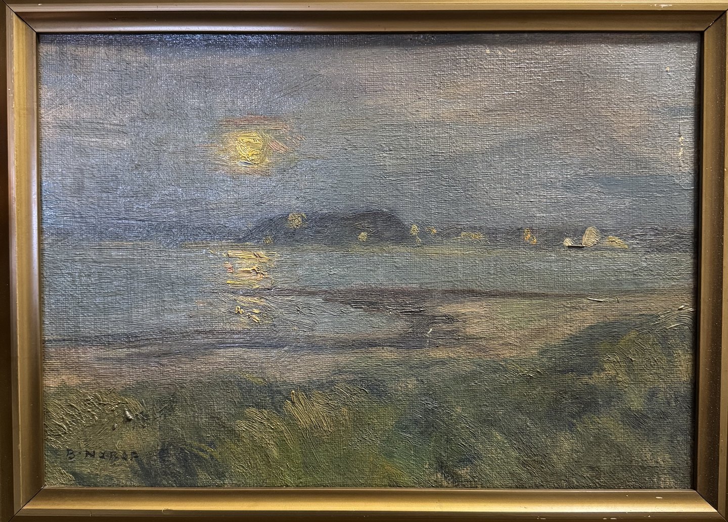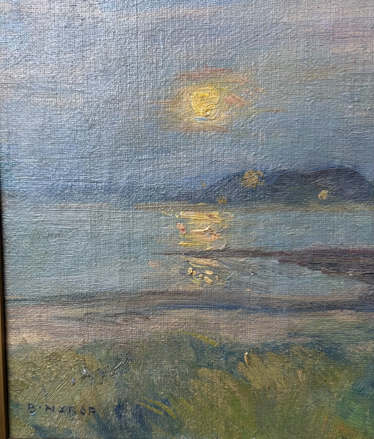 Maleri i ramme. Motiv med “Solnedgang en sommerdag” af Børge Nyrup (1881-1948). Formodes at være malet omkring 1920. I god stand. Ingen skader. Trænger til en rensning. Mål: 37,5 x 49 cm