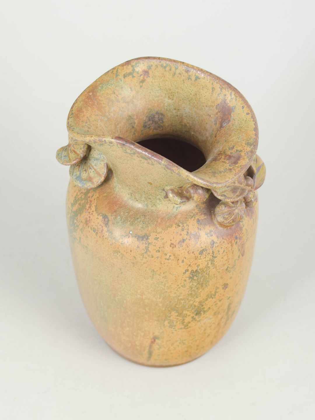 Hånddrejet stentøjsvase med modelnummer 16, udført i organisk form med reliefdekoration af blade ved halsen og dækket af levende glasur i varme jordfarver med nuancerede overgange.