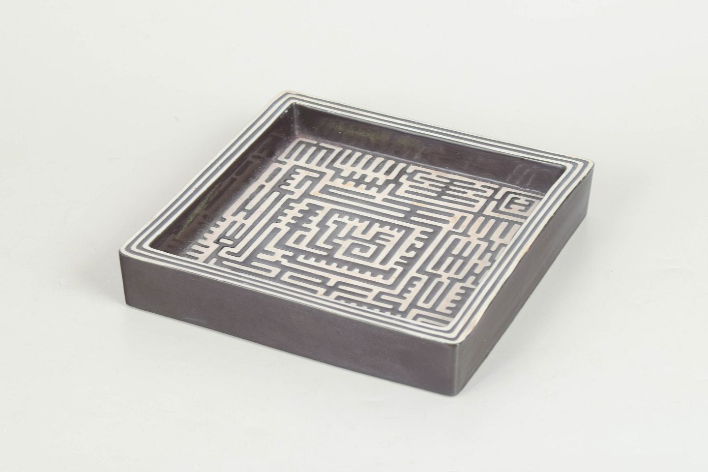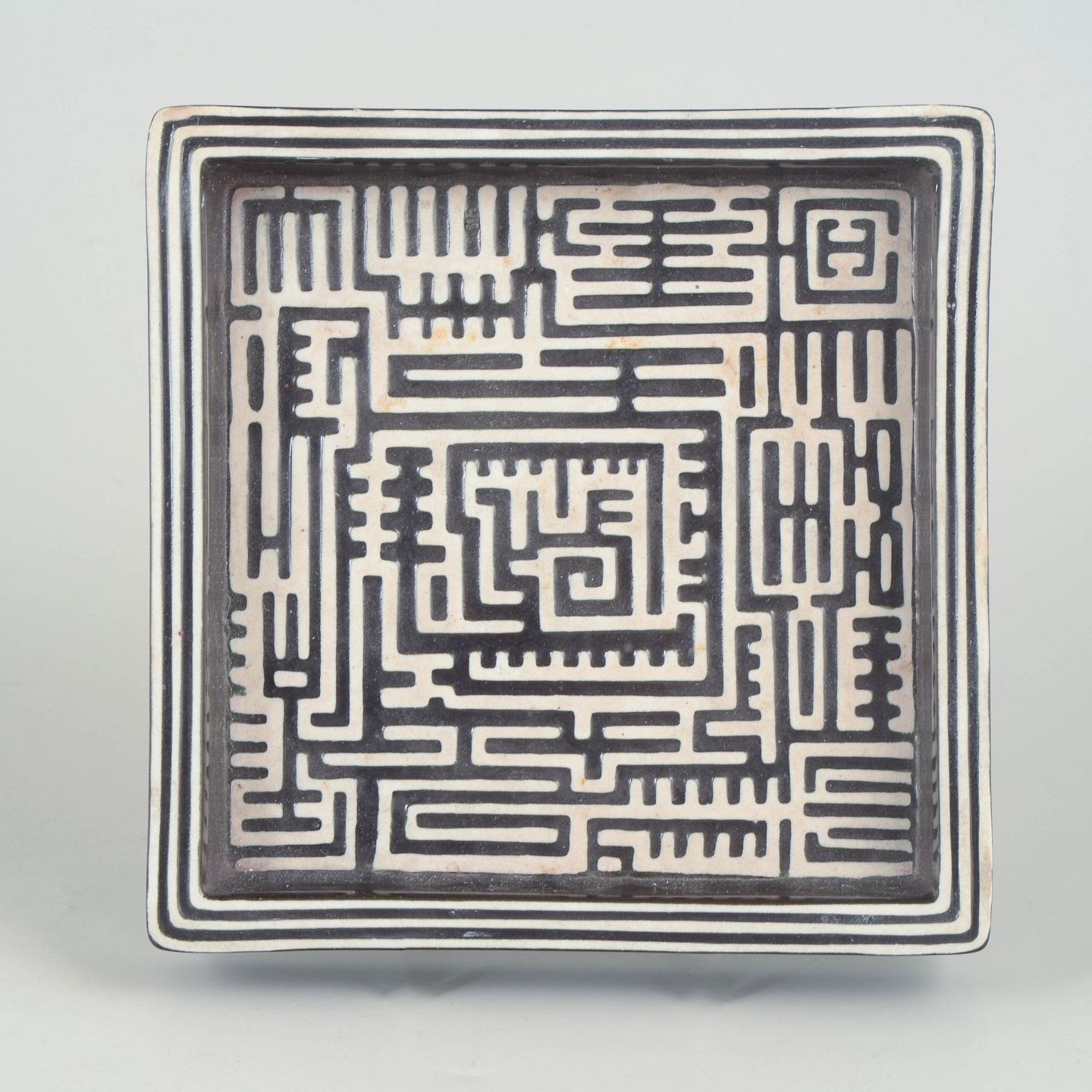Kvadratisk fad i stentøj dekoreret med det karakteristiske Domino-mønster i sort på lys bund med grafisk labyrintlignende ornamentik. Model Domino.