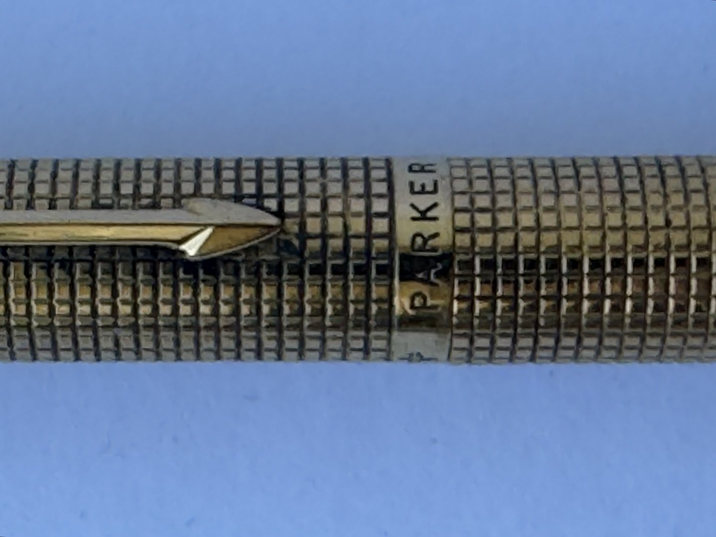 Parker 75 Cicelé fyldepen med ternet mønster på overflade i guld-double. Fremstillet i U.S.A. i 1970’erne. Fuldt funktionsduelig. Fin overflade uden stød eller andre overflade brugsspor. Har dog brug for at blive pudset. For enden en 14 karat 585 guldspids fremstillet i Frankrig. L. 13 cm.