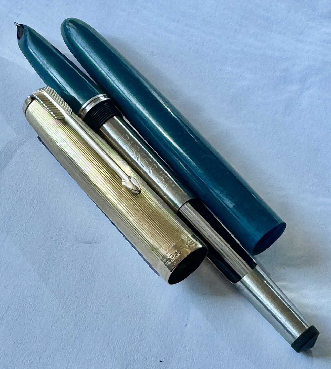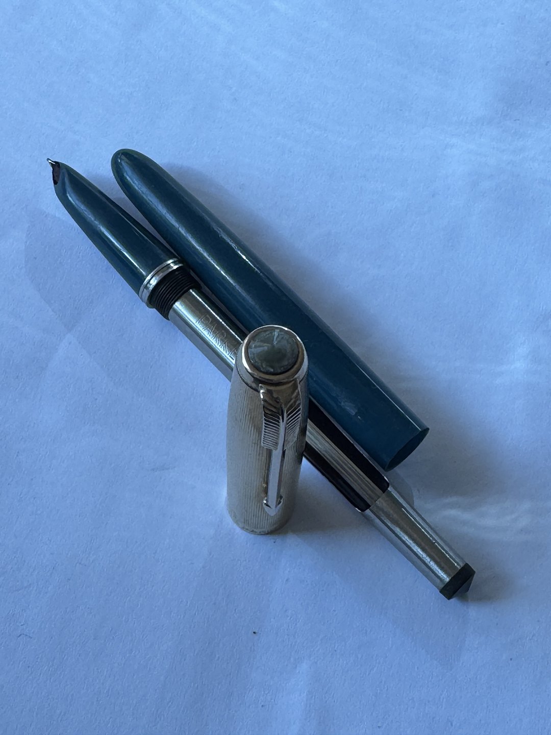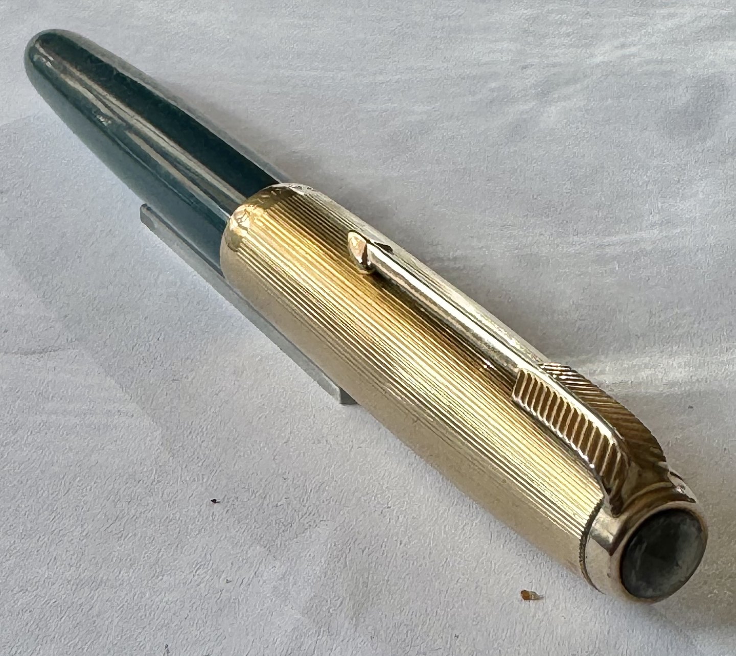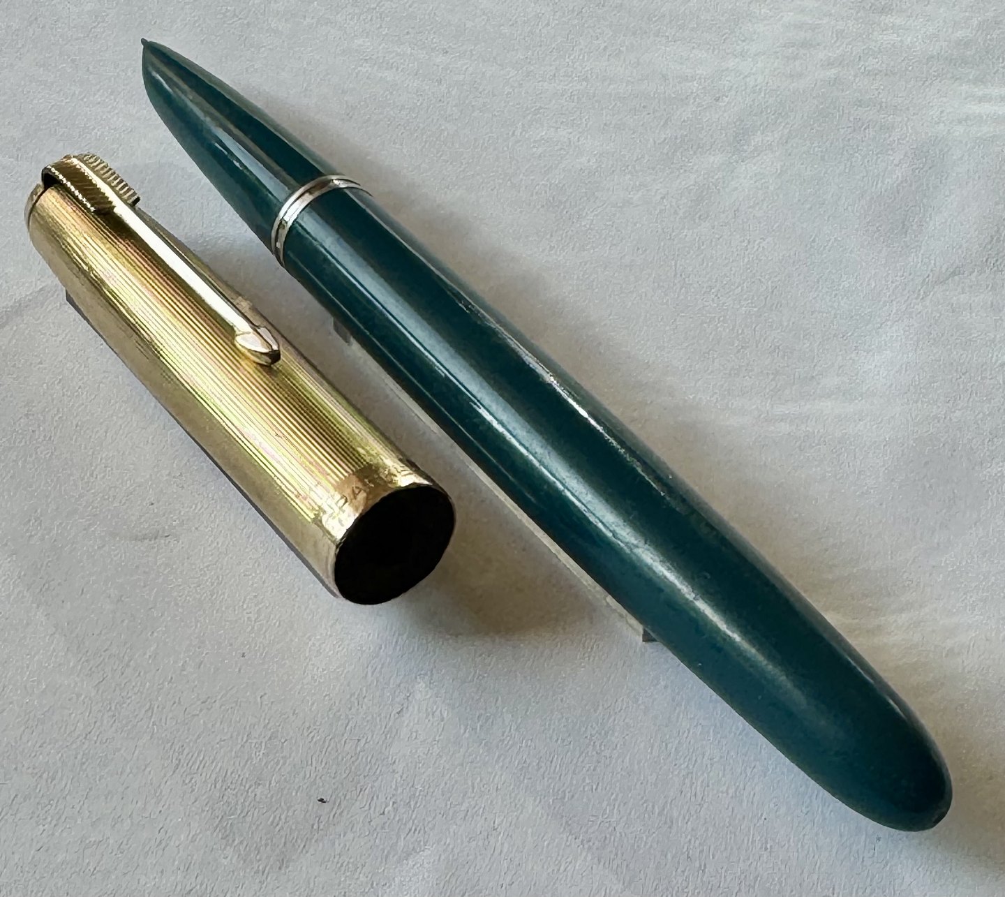 Skriveklar vintage fyldepen: Grøn Parker 51 fyldepen med guld double hætte. Klar til at blive brugt. Ingen skader eller reparationer. Almindelige brugsspor bl.a. på hætten med lidt stød og mærker ! L. 14 cm.