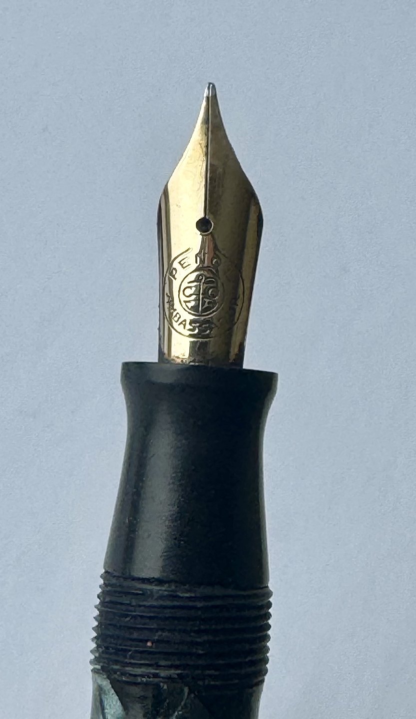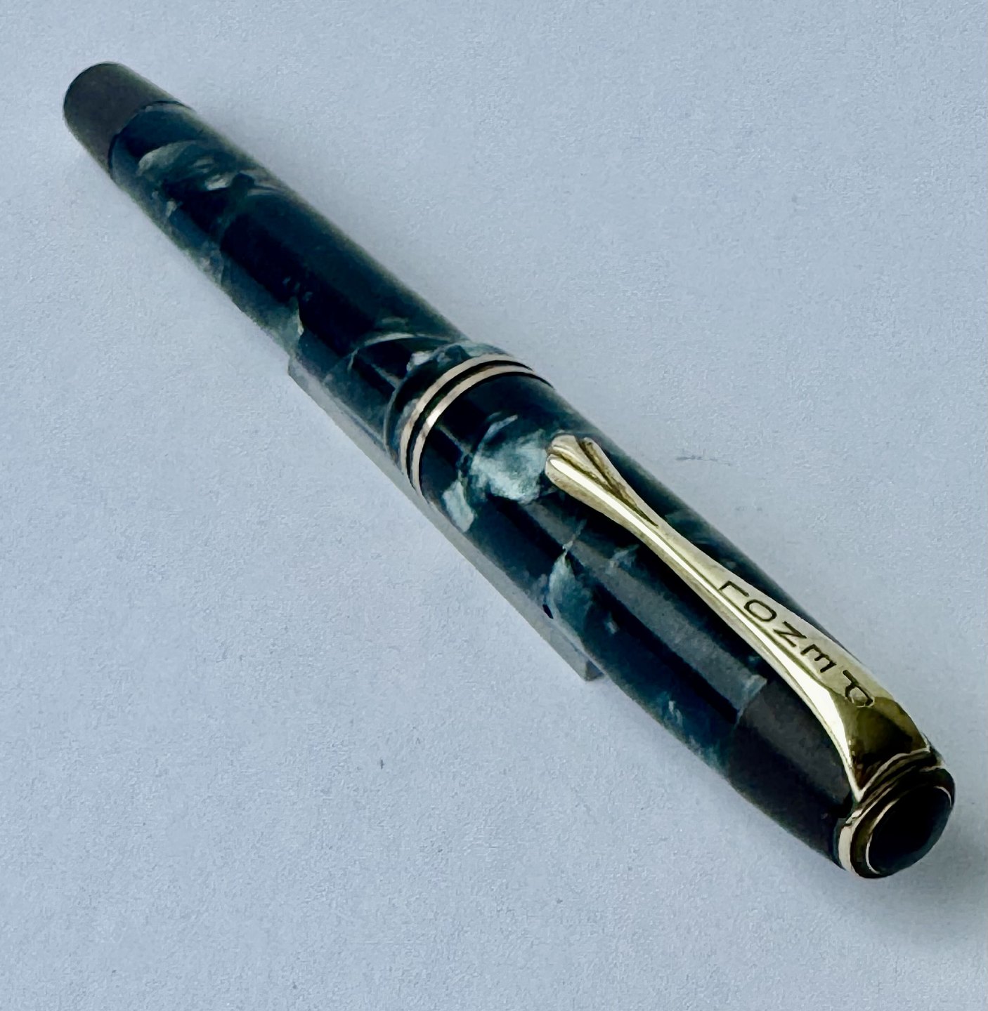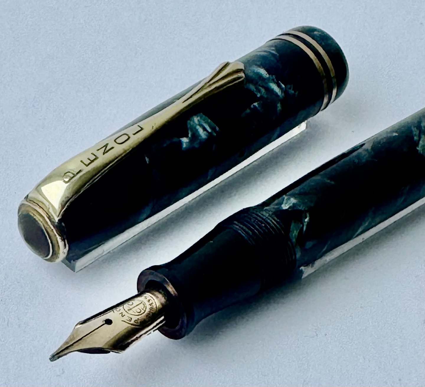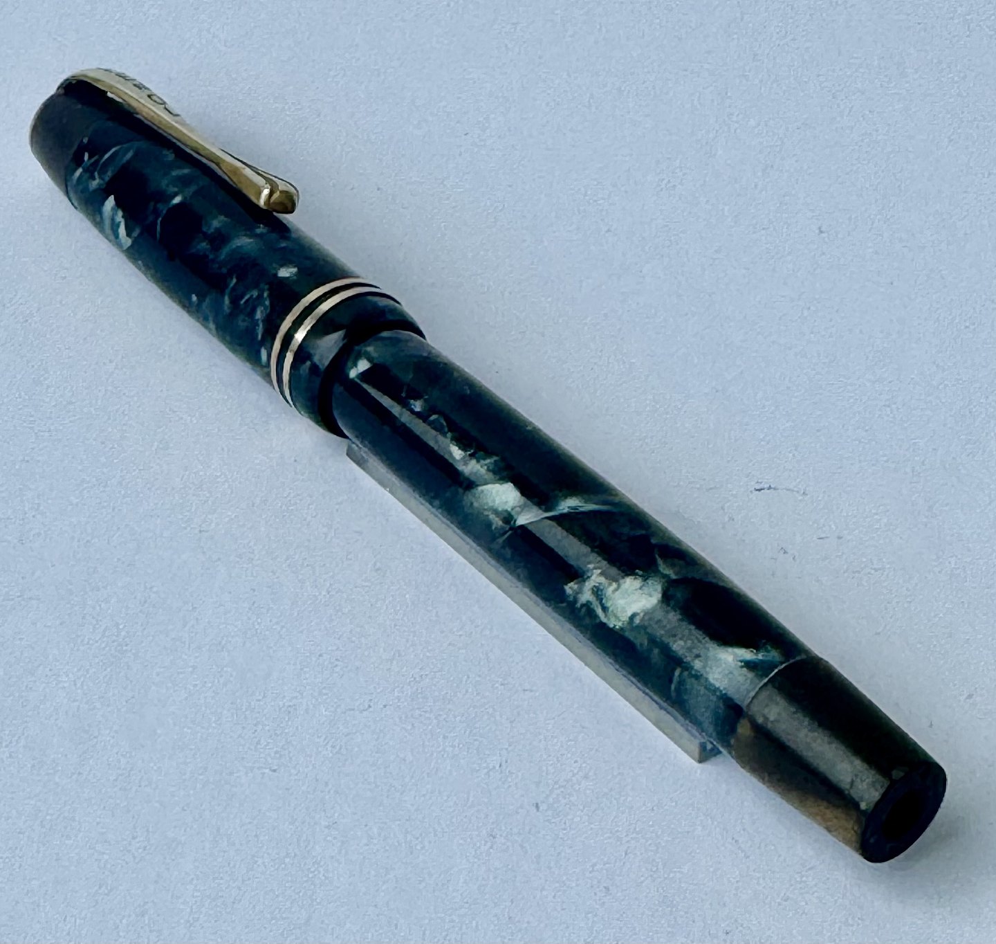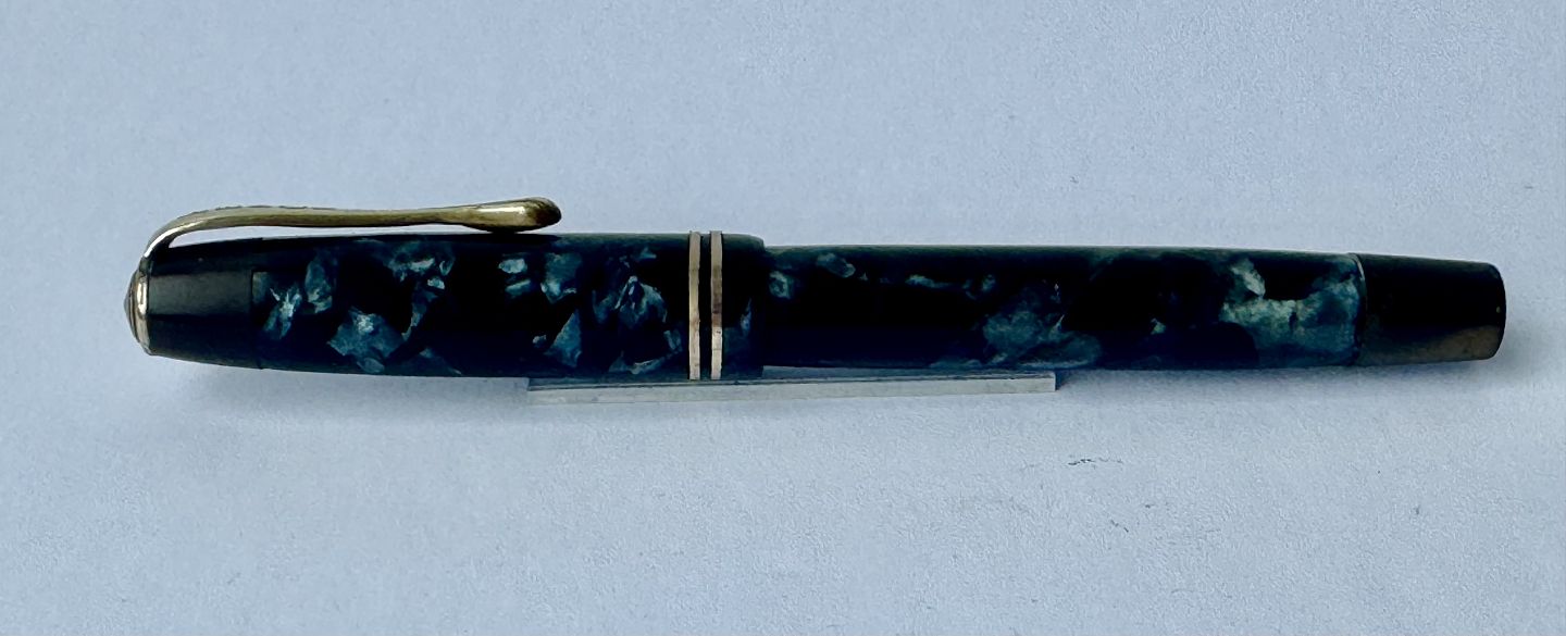 Blå marmoreret Penol Ambassador no. 5 fyldepen. Push button filler. Der skal indsættes en ny gummisæk før den igen kan optage blæk og skrive igen. Ny gummisæk kan indsættes for et tillæg på kr. 250,- Alle dele originale til denne model. Ingen skader eller reparationer. Dog mangler “knappen” på den lille korte bundskrue, hvorfor der er hul - se fotos. Længde 13 cm