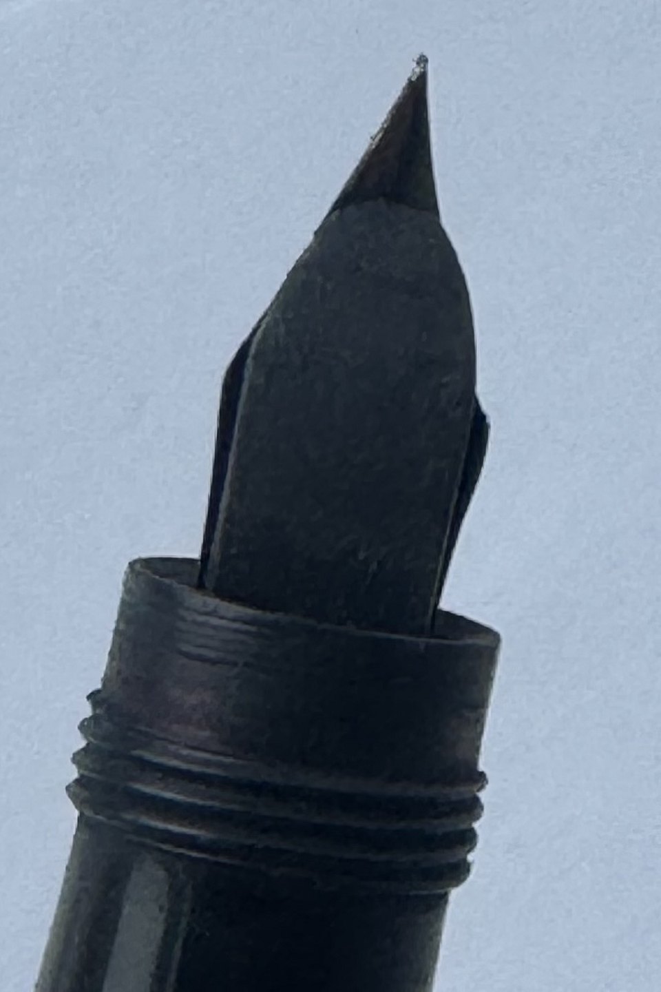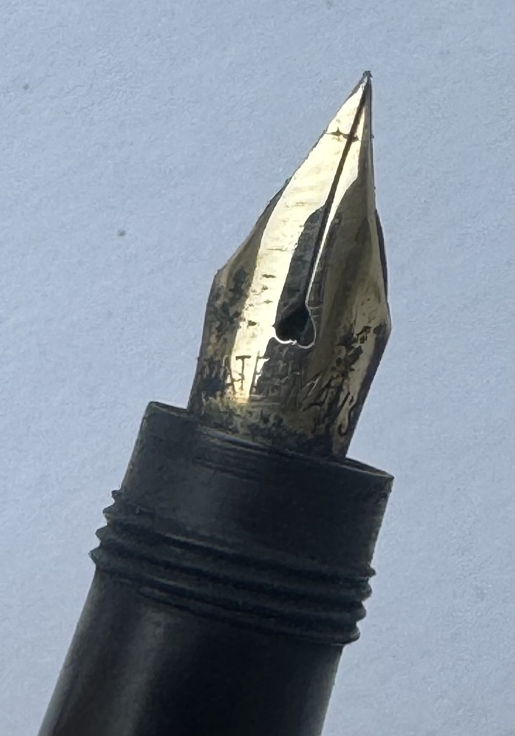 Sort Waterman Safety fyldepen fra 1903. Modelnummer 42 1/2 V er indgraveret på bunden (se foto). Midt på pennen ses et mavebælte i messing dekoreret med en blomst samt ejer initialer B. B. Den originale guldspids kører frem og tilbage når der drejes på bundskruen. Hætten indgraveret WATERMAN’S PAT.APR.28.1903. På bunden, på siden, ses svagt indgraveret WATERMAN samt SAFETY. Fremstår i god stand uden skader eller reparationer. Lidt misfarvning. Længde: 8,7 cm