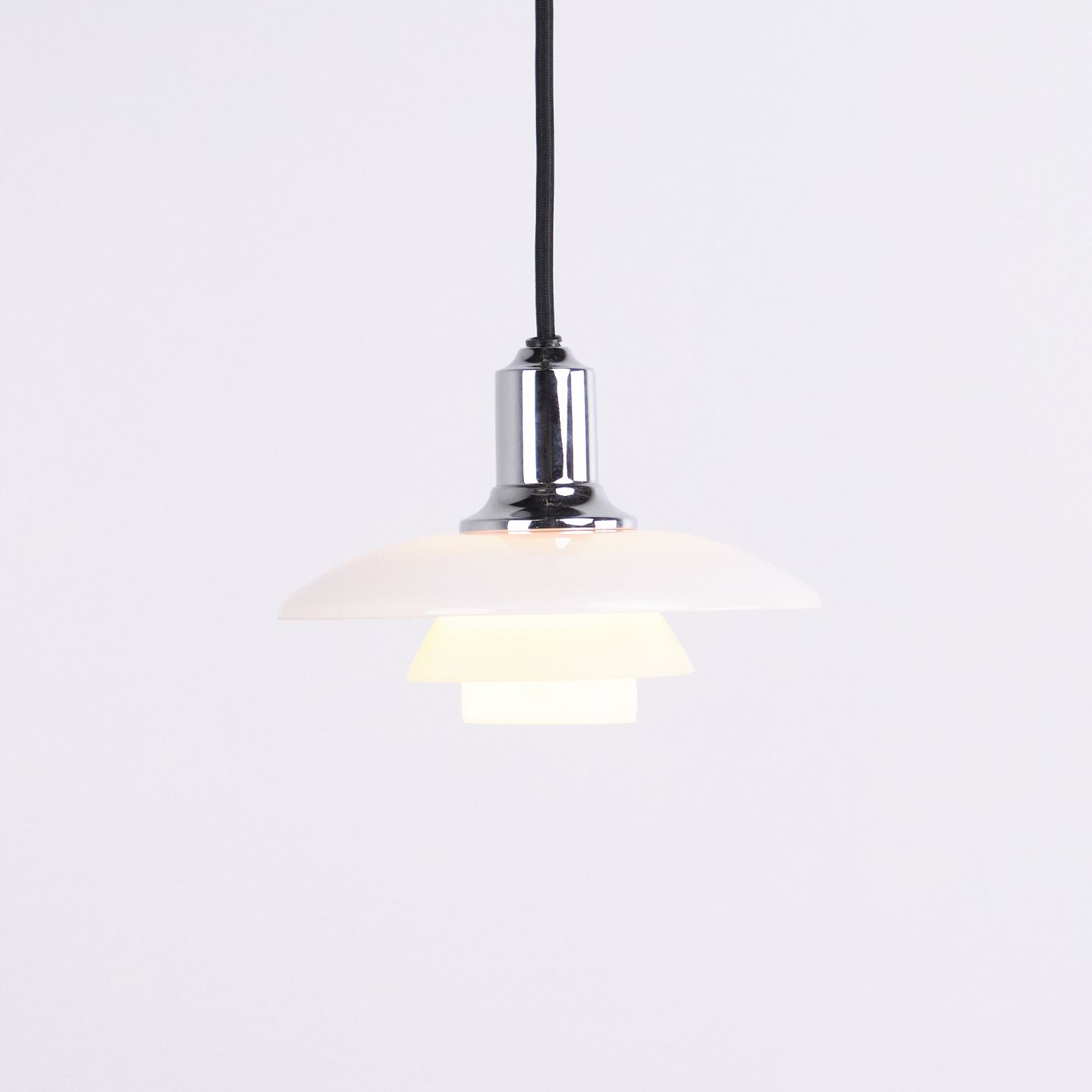 PH 2/1 pendel i krom med opalglas fra Louis Poulsen. Designet af Poul Henningsen med klassisk dansk lysdesign og blændfri belysning.