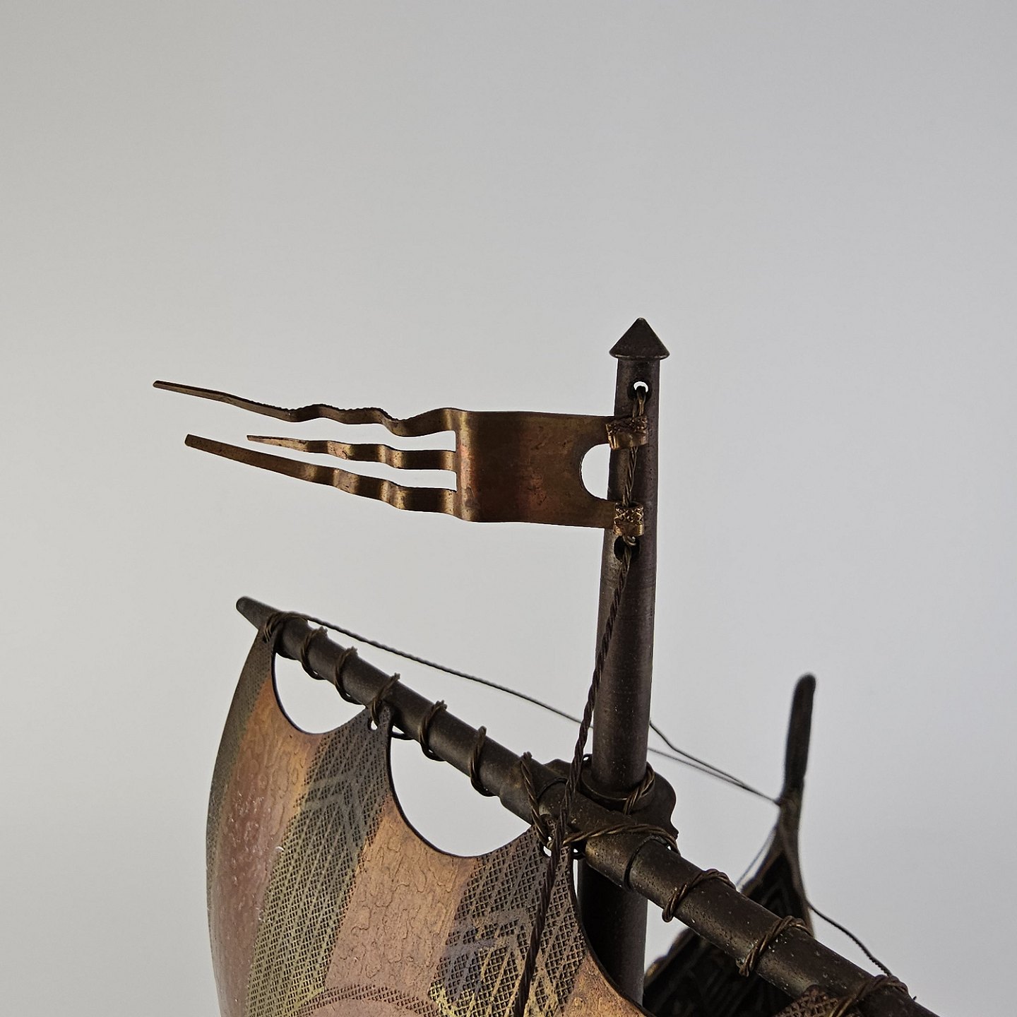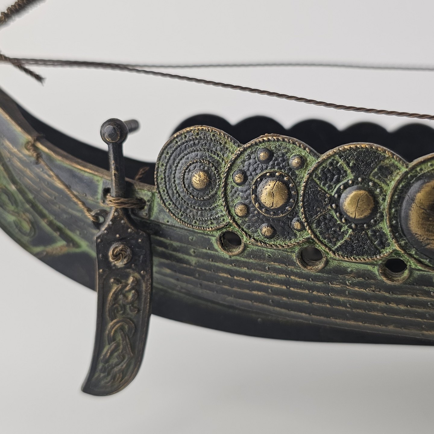 Miniature replika af et dansk vikingeskib lavet i bronze med træfod