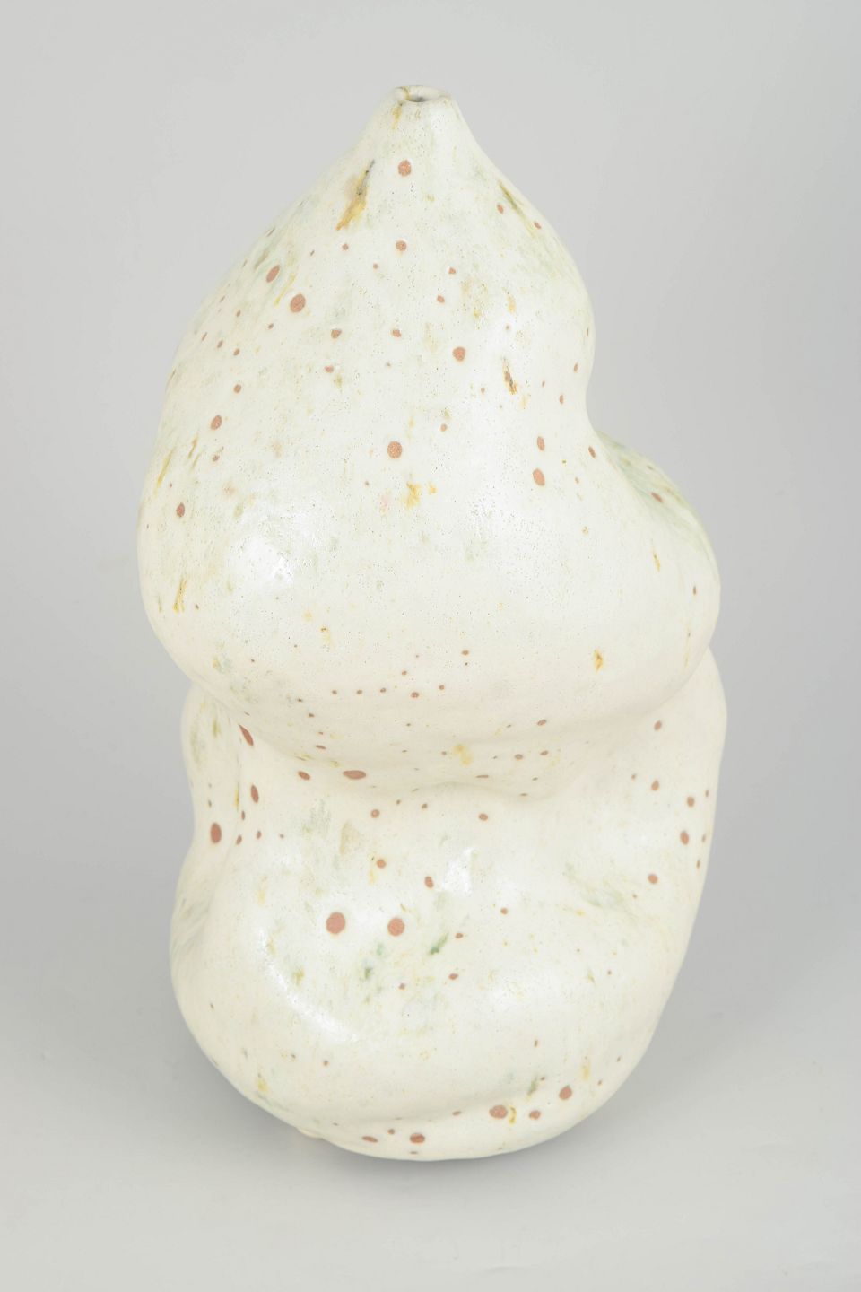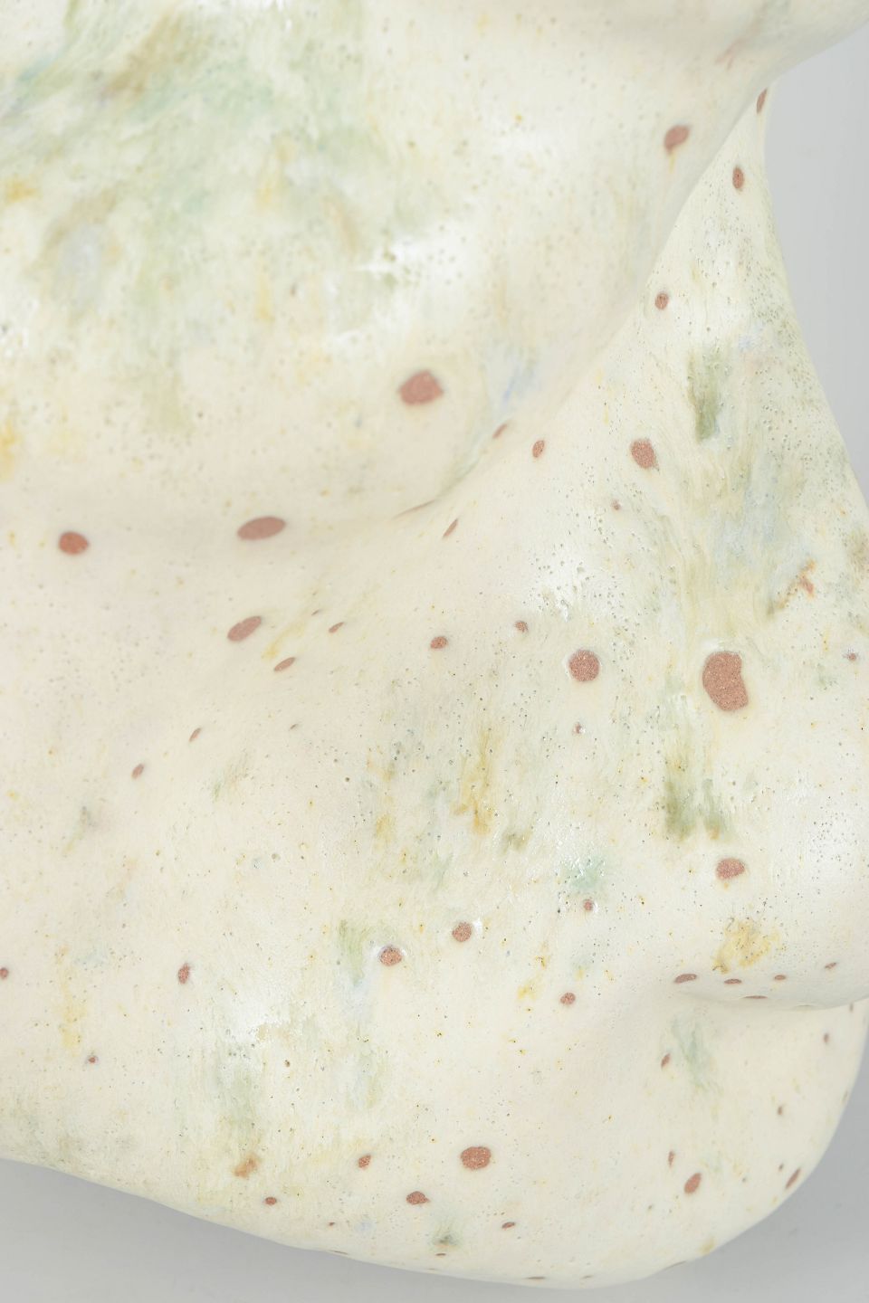 Unika stentøjsvase, organisk formet. Det varme brune stentøjsler er dækket af et lag cremefarvet glasur med grønlig tone og masser af pletter uden glasur der viser lerets varme tone.
