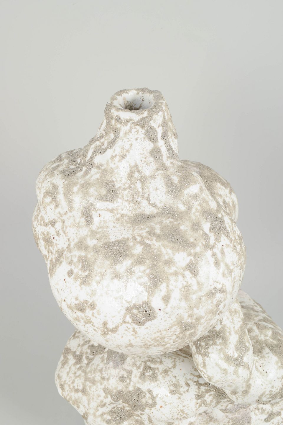 Høj unika stentøjsvase, organisk formet. Glasuren er en hvid blank med grå, mat glitter glasur, der henleder tankerne på vådt sand.