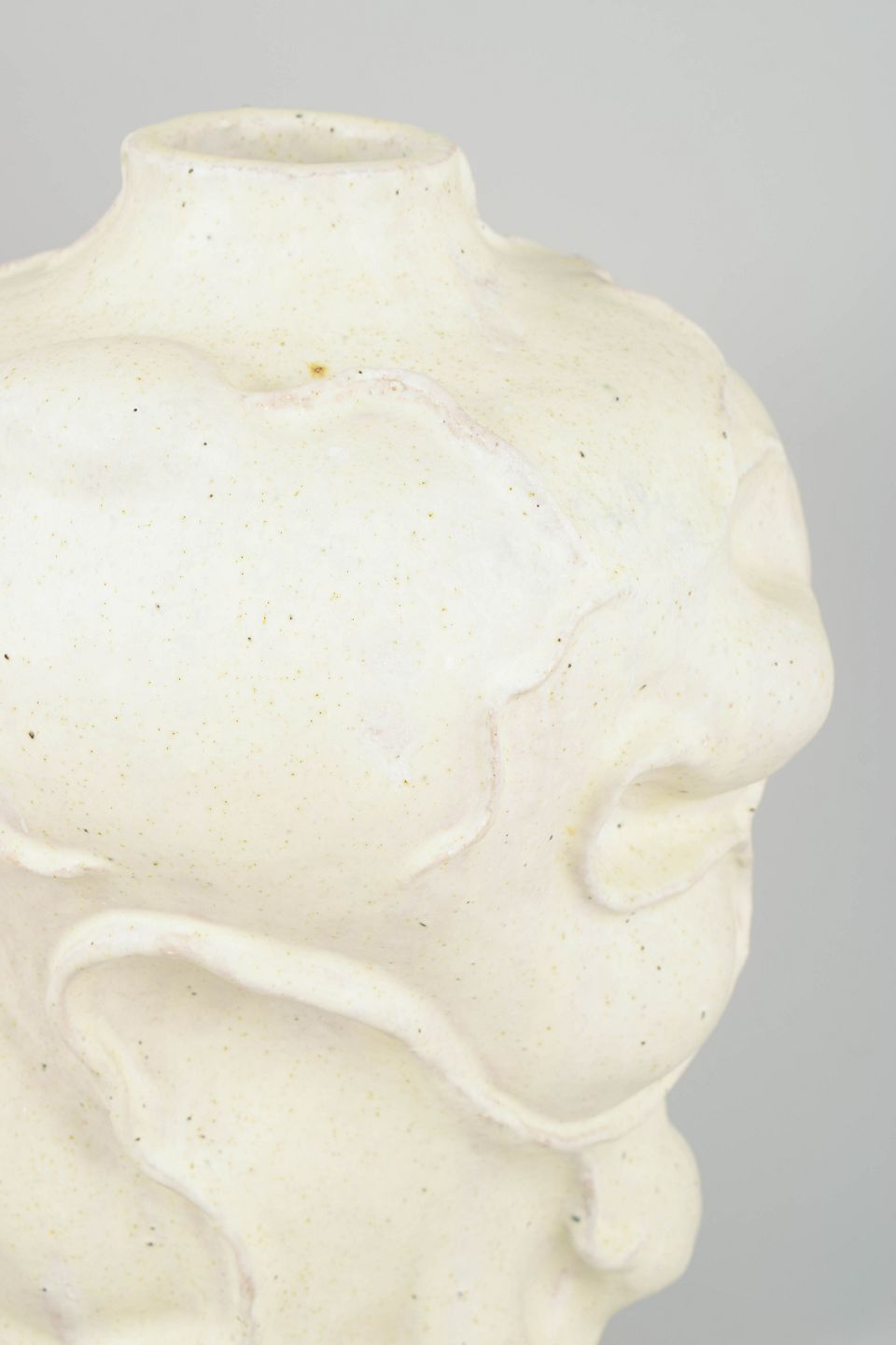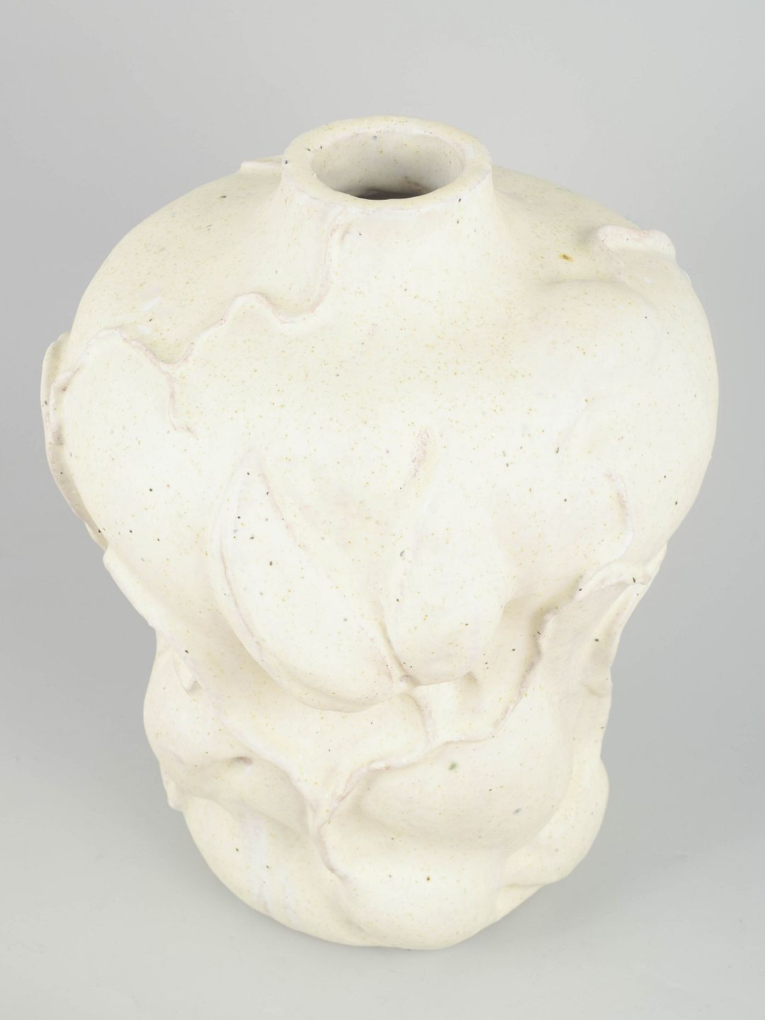 Meget stor unika stentøjsvase, organisk formet med blomstermotiv og dækket af beige, mat glasur.