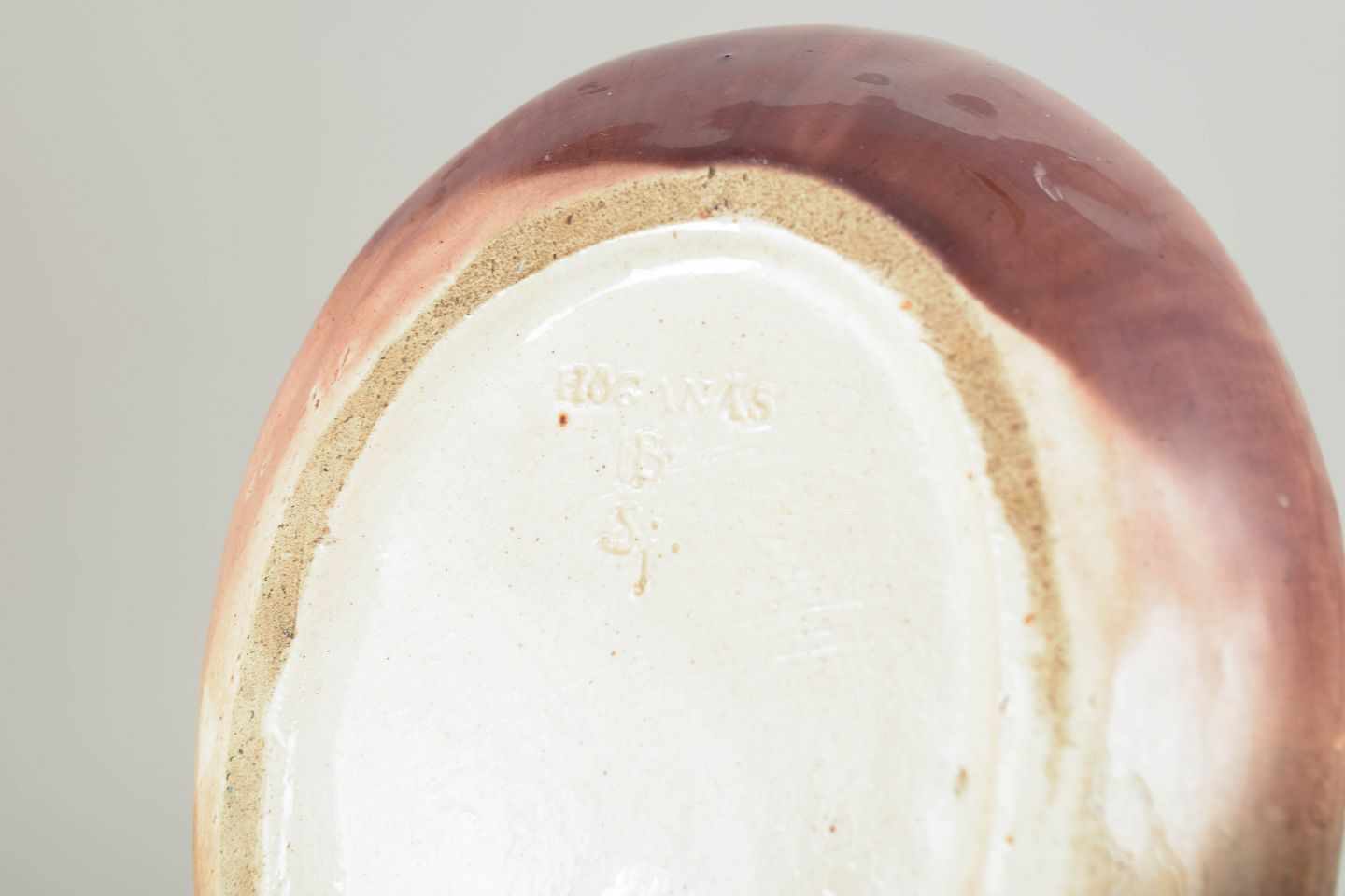 Skål i stentøj udformet som et vildsvinehoved med naturalistiske detaljer og glaseret i varme brunlige og rosa nuancer. Dekorativ og funktionel genstand med karakteristisk tidlig 1900-tals formsprog.
