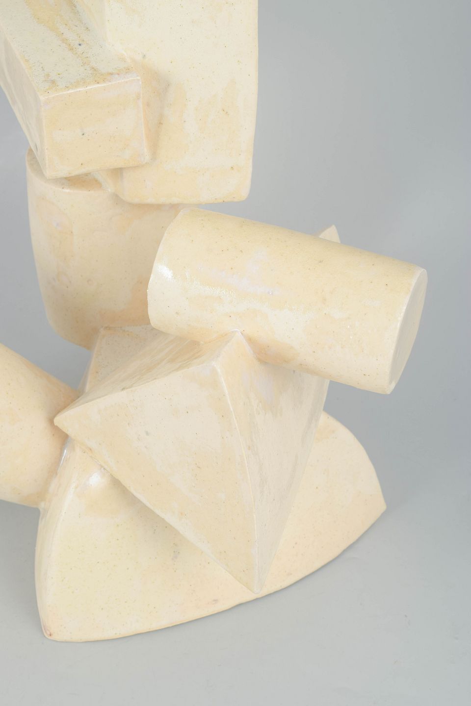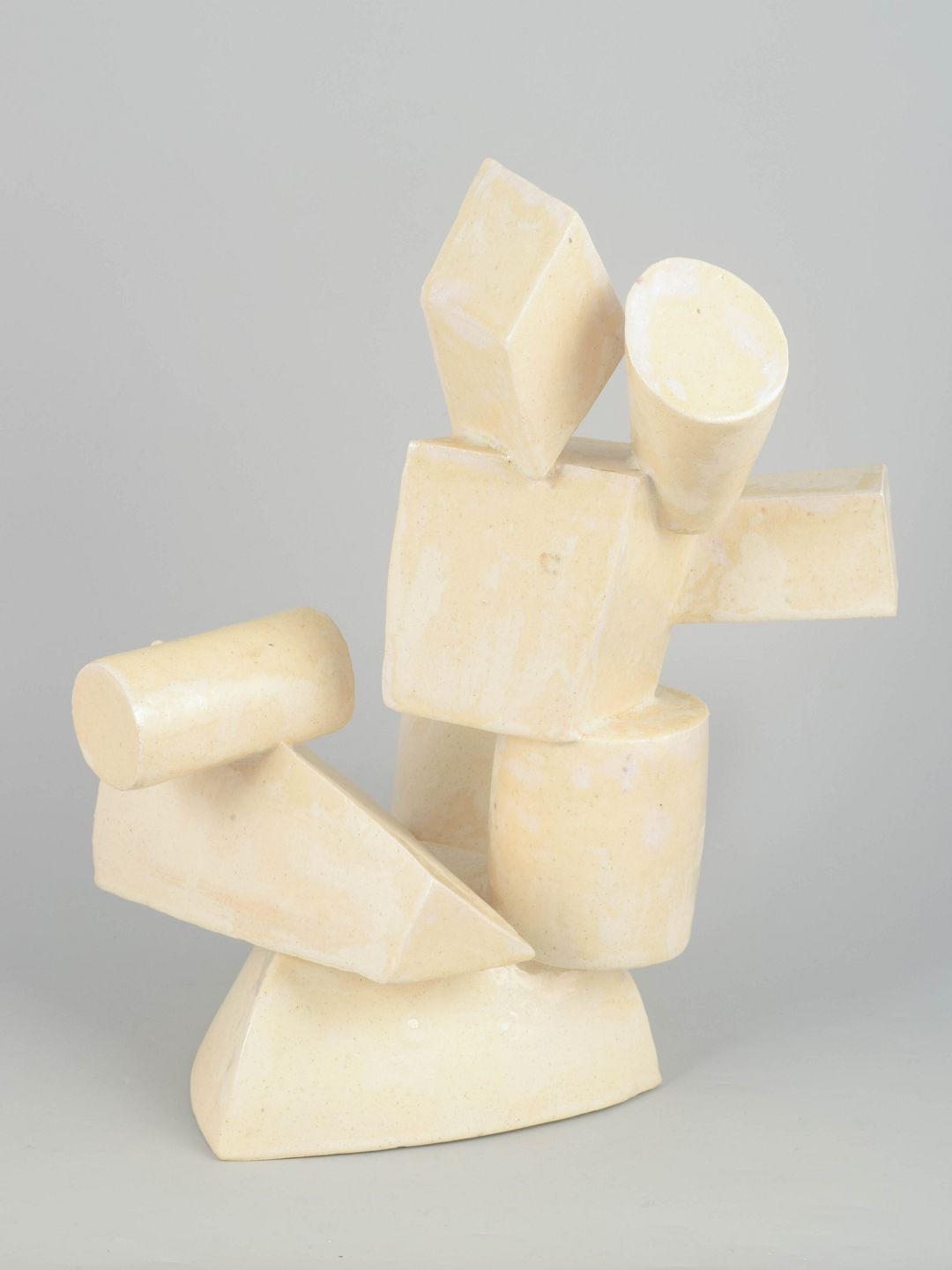 Monumentalt stor stentøjsskulptur i kubistisk stil, med blank cremefarvet glasur overflade.