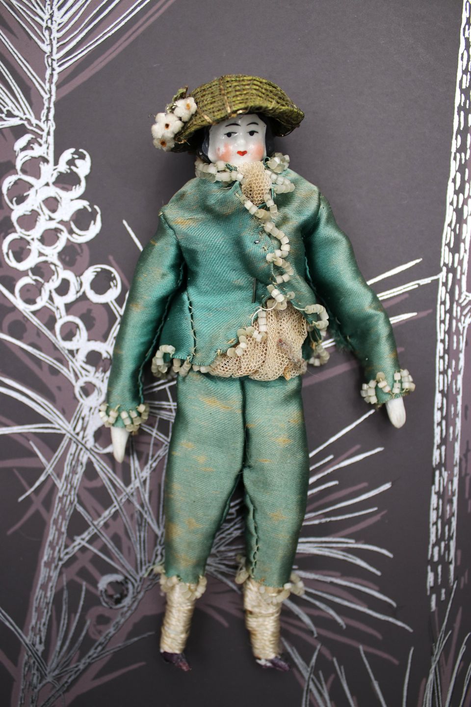 1) H: 19cm. Dame med hoved , hænder og fødder i porcelæn , krop i stof og iklædt gammelt silketøj og hat. - PRIS: 700 Kr. RESERVERET !
