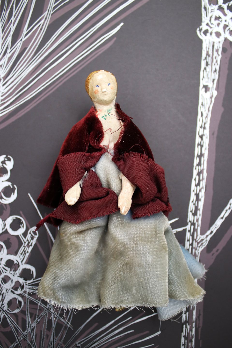 3) H: 14cm. Kvinde Dame med hoved , hænder og fødder i træ , krop i stof og iklædt gammel tøj i velour. - PRIS: 300 Kr.