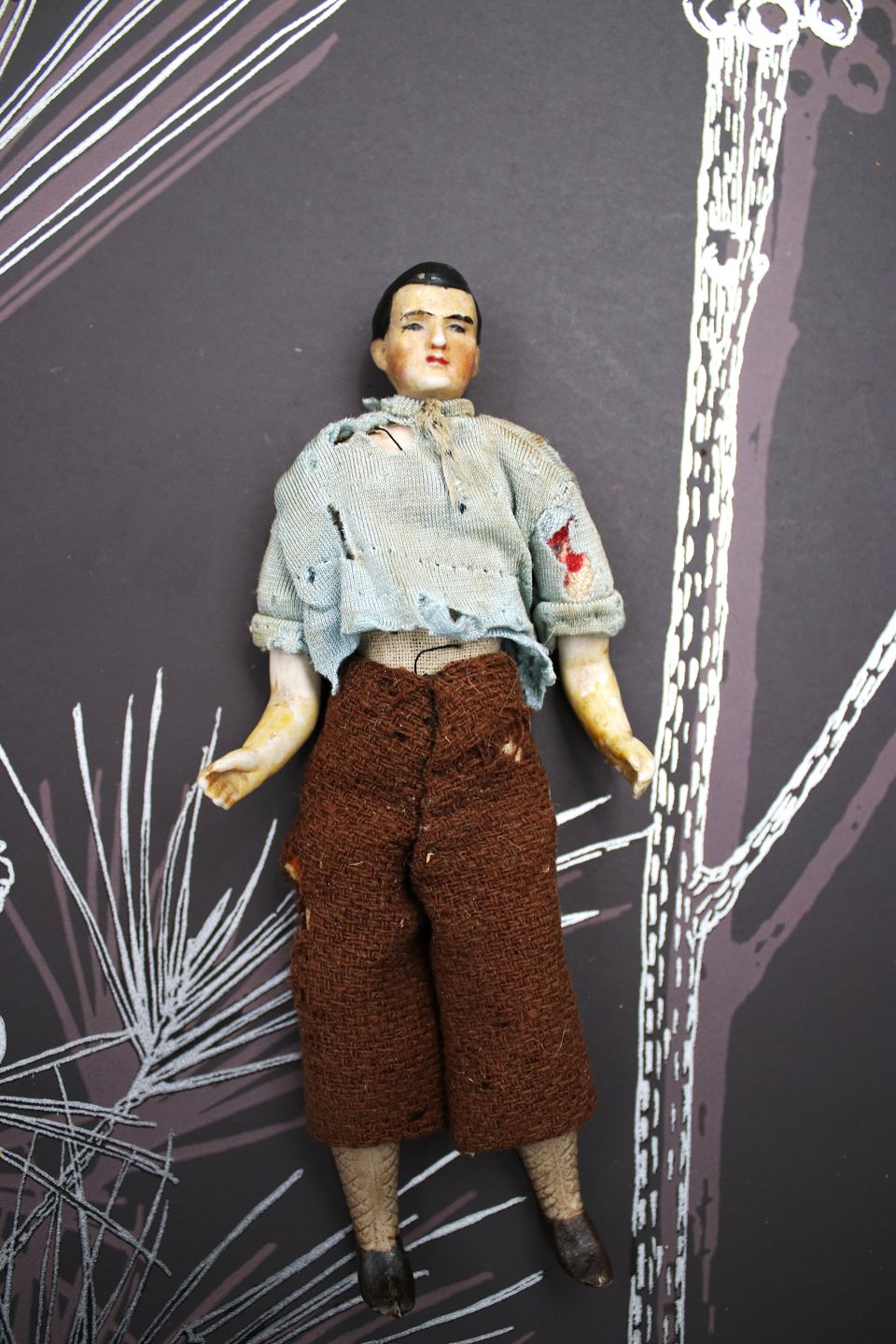 4) Mand med hoved , hænder og fødder i porcelæn , krop i stof og iklædt gammelt stof tøj. - PRIS: 400 Kr.