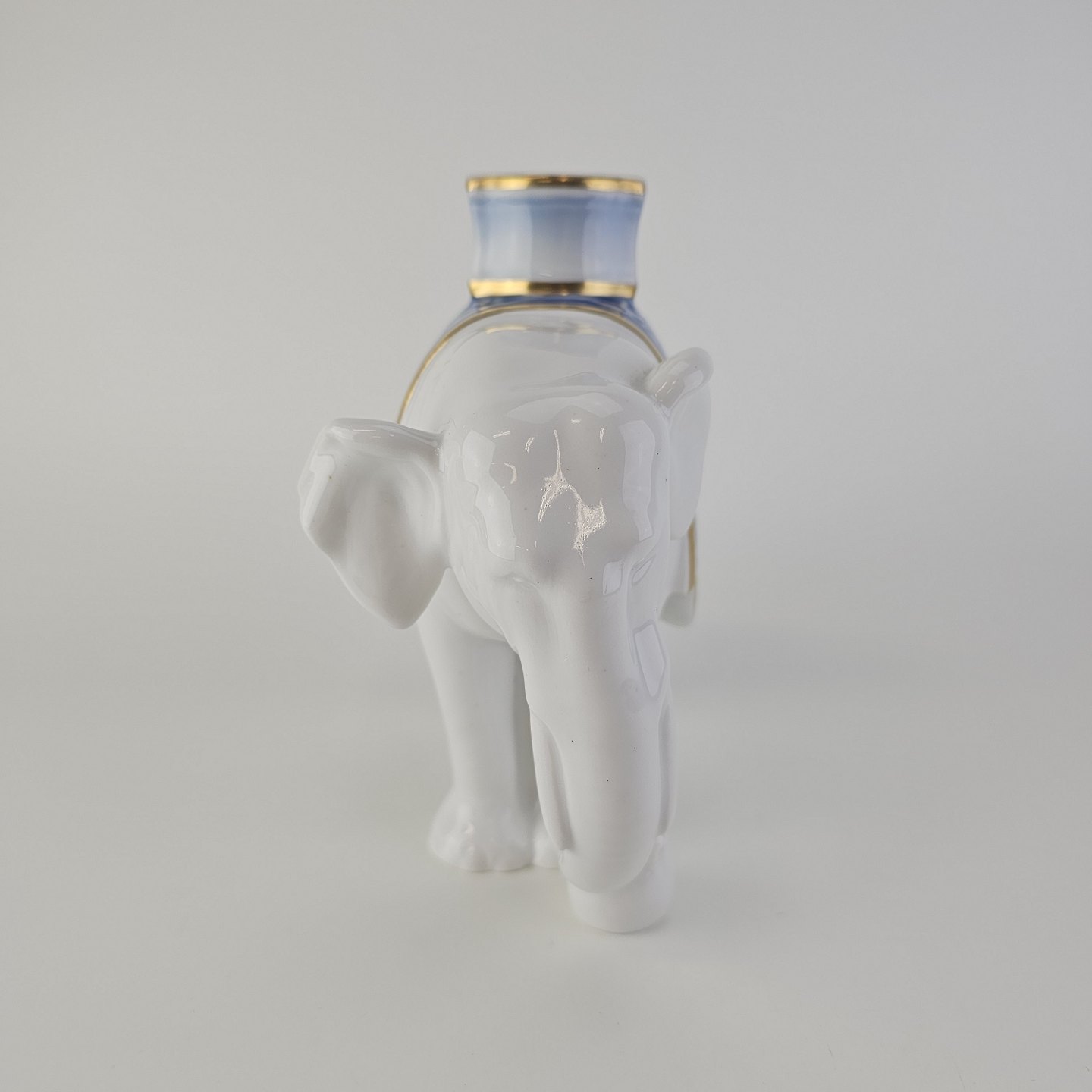 Figur i hvidt porcelæn med motiv af en elefant med teksten 2. marts 1908-1933 på den ene side. Lavet specielt til Carlsberg, brugt som gave derfra.