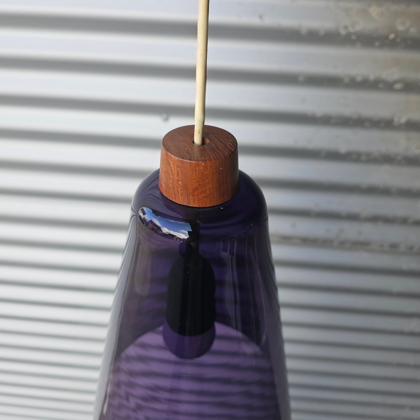 Sæt af to pendler i lilla glas med montering i teaktræ