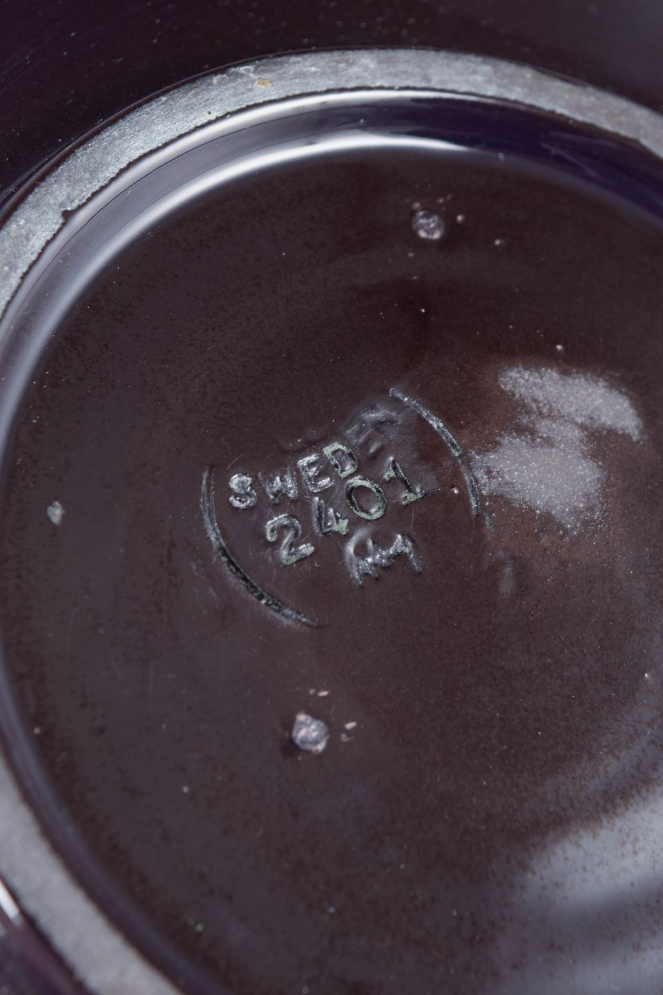 Stort fad i stentøj model 2401 med karakteristisk kraftig glasur i dybe violette nuancer og let krateragtig struktur.