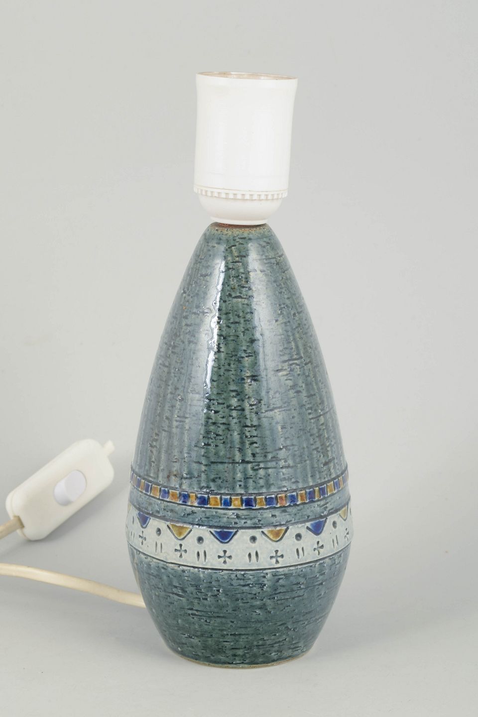 Dekorativ bordlampe i stentøj med karakteristisk reliefmønster og grøn glasur, monteret med lys fatning. Kort ledning uden stik.