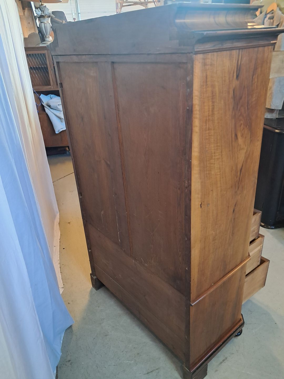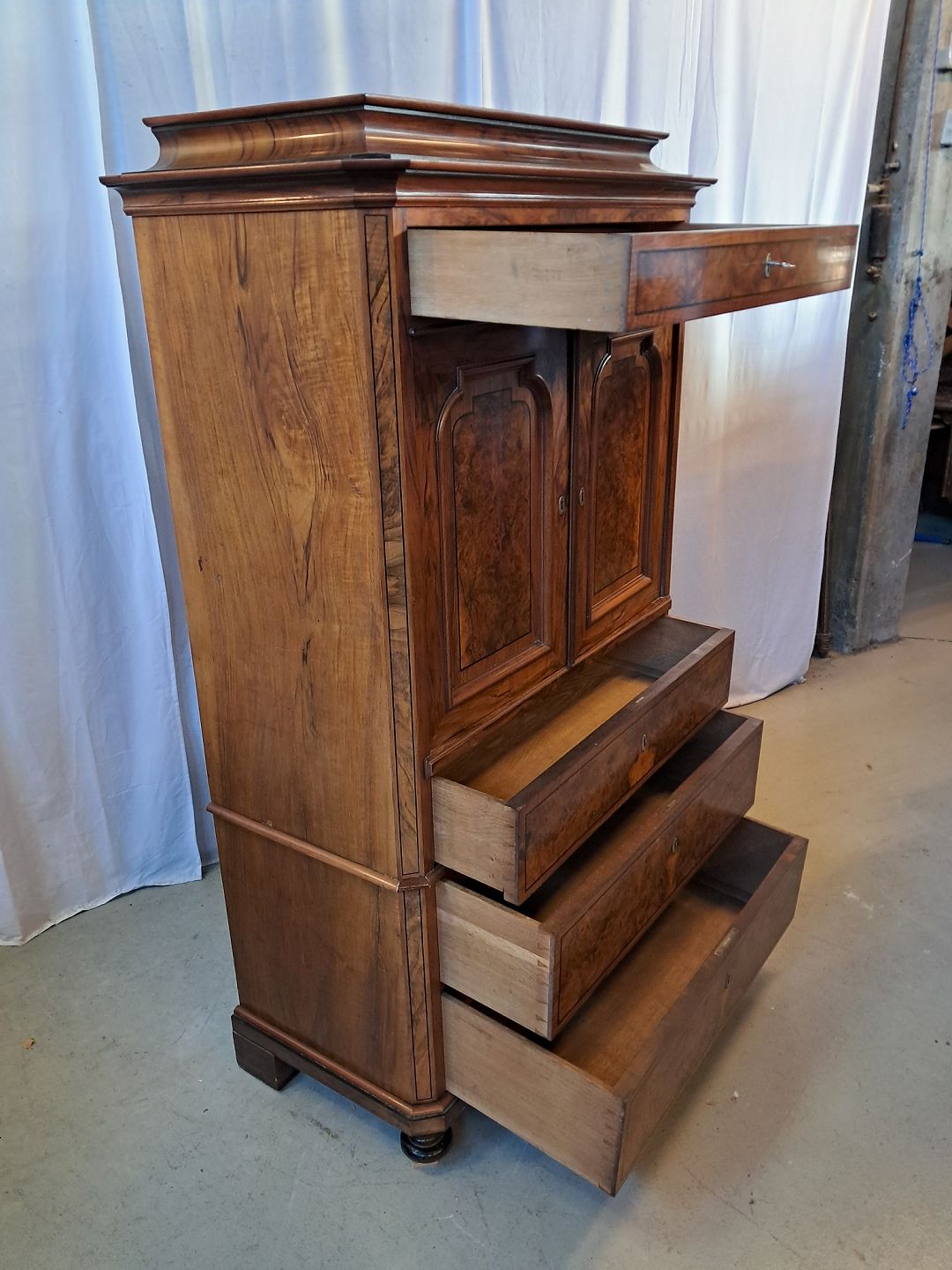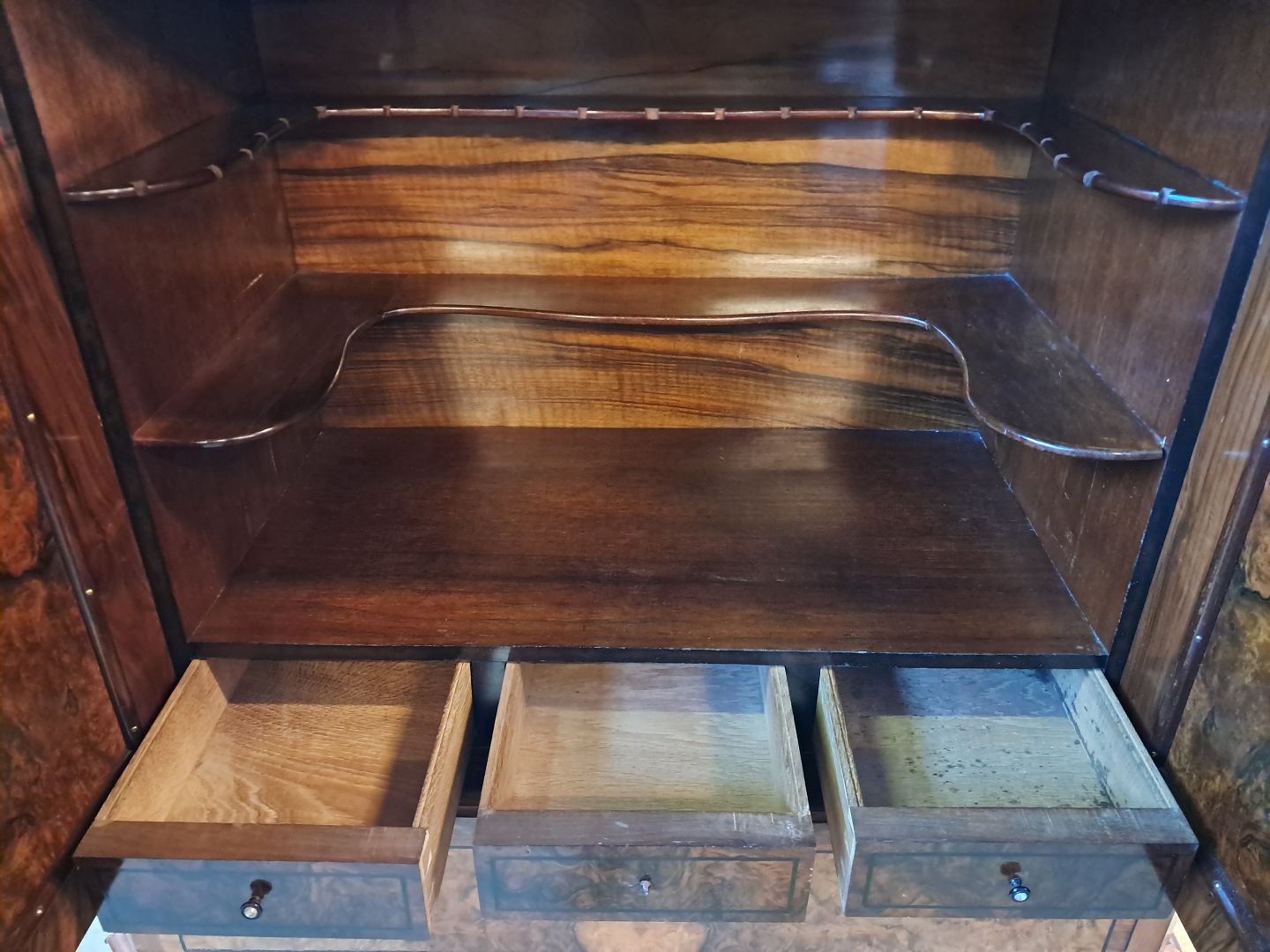Skab i fineret mahogni og nøderod, fra 1900erne.