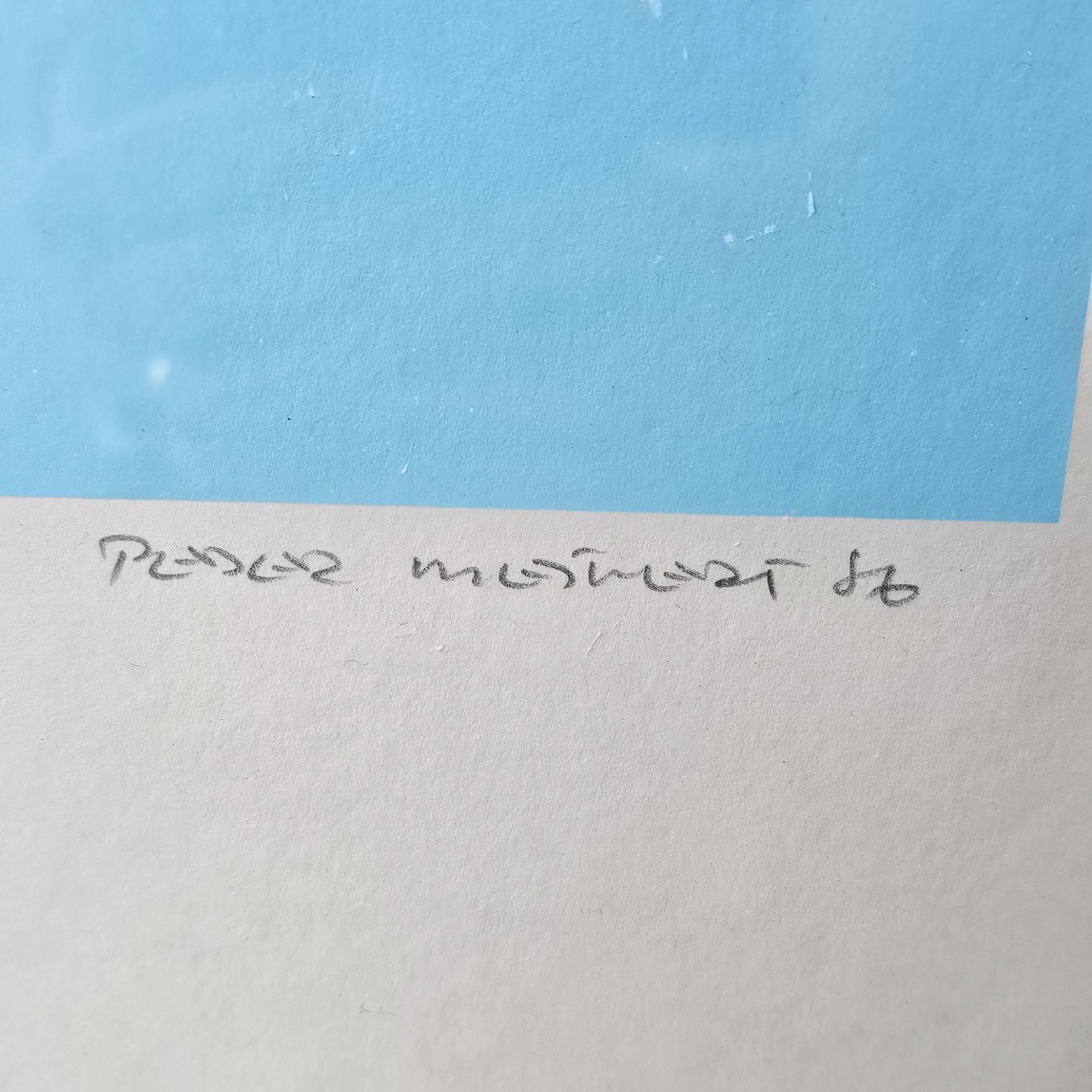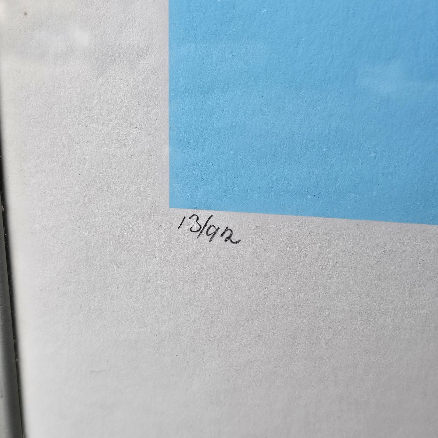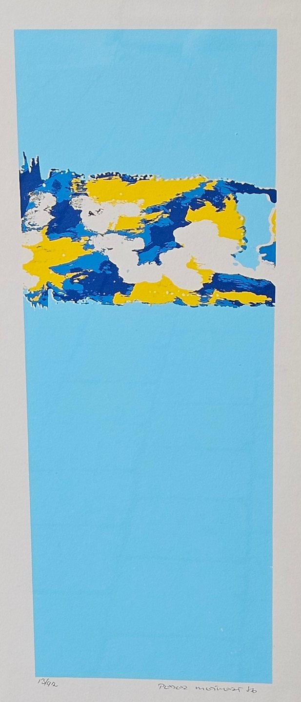 Litografi med blå, hvide og gule farver på lyseblå baggrund i metal ramme. 13/92