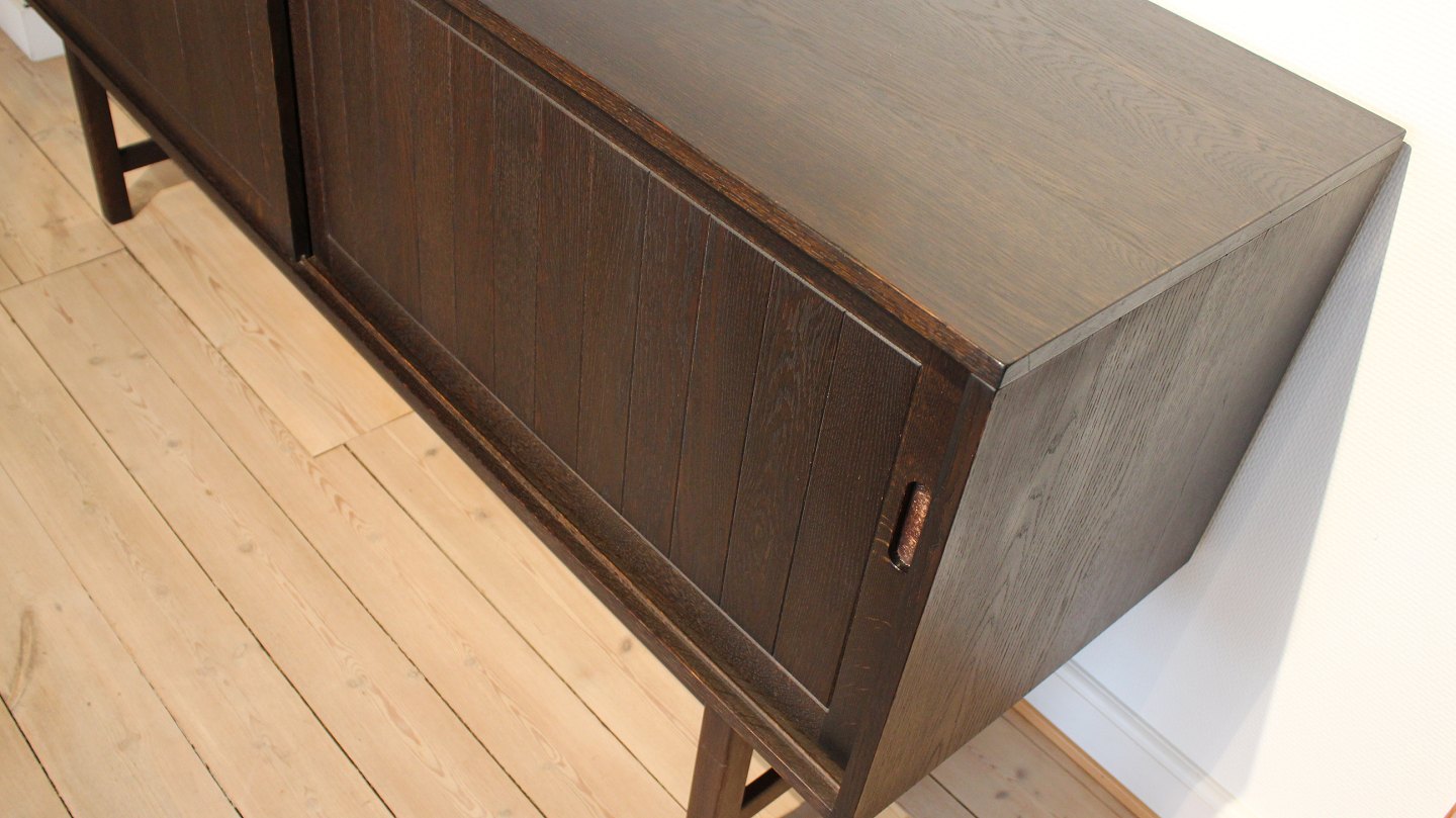 Lang lav skænk af mørk massiv og fineret egetræ