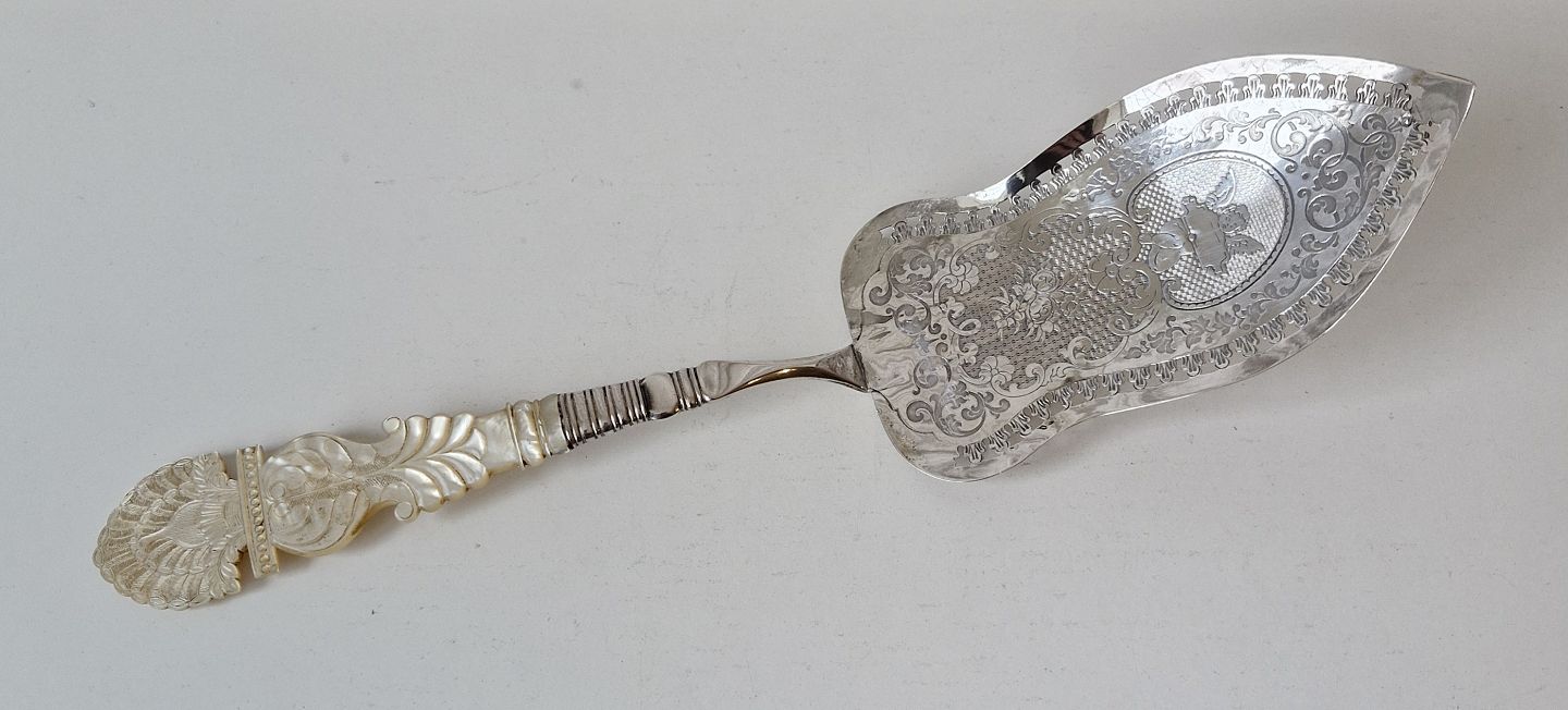 Stor fiskespade i sølv med perlemors håndtag. Sølv laf med gennembrudt kant, smukt dekoreret med en engel og blomster. Perlemors håndtaget er smukt udskåret med en påugl.