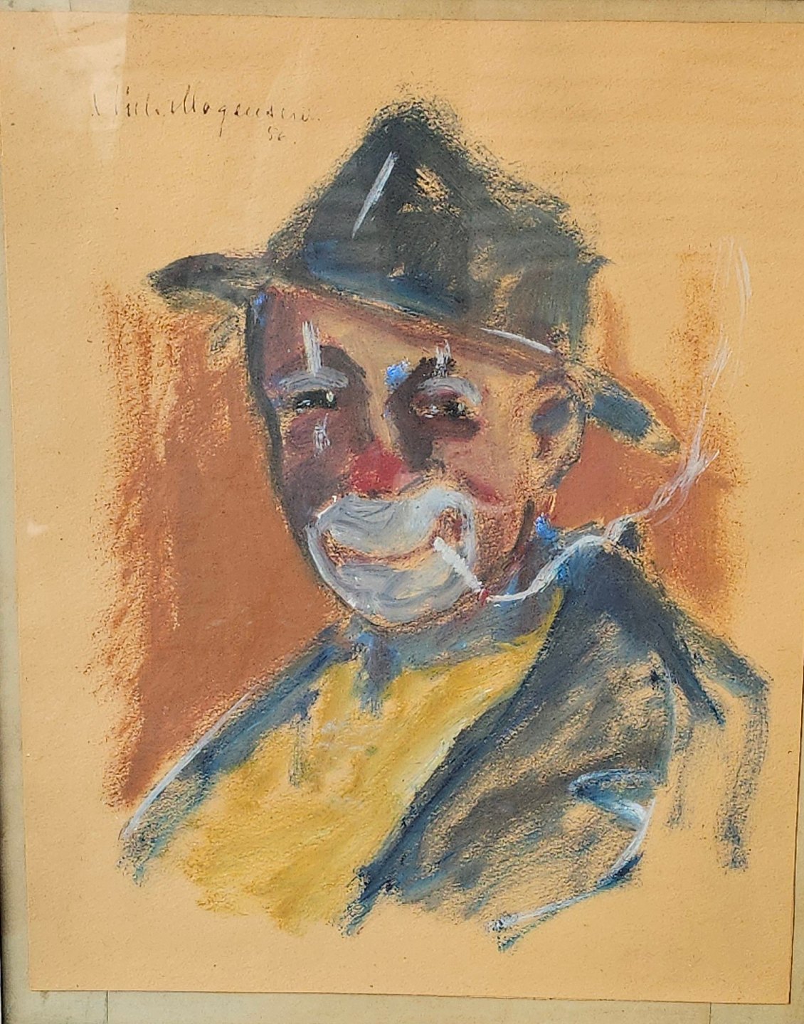 Oliekridt på papir monteret i hvidmalet ramme med motiv af en klovn