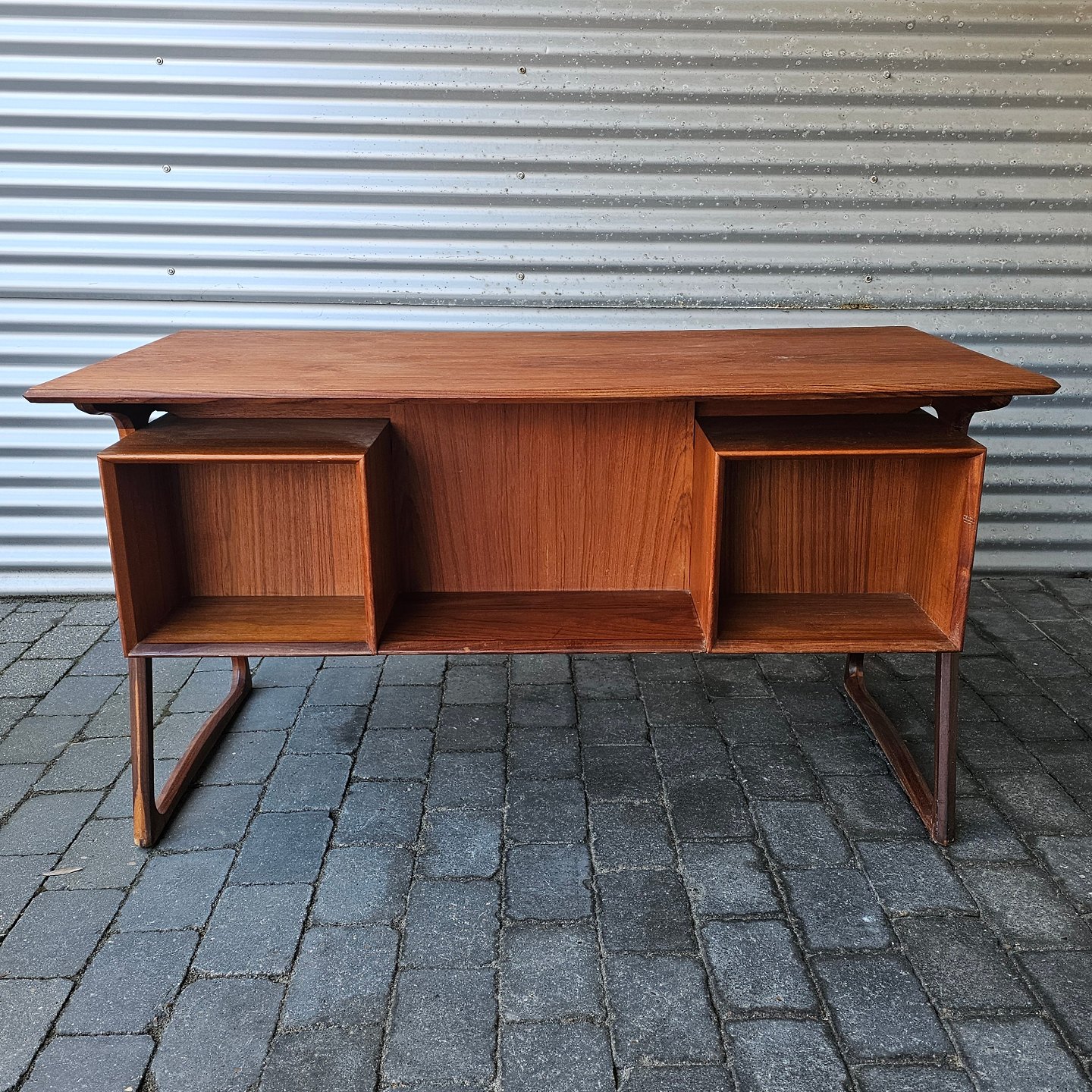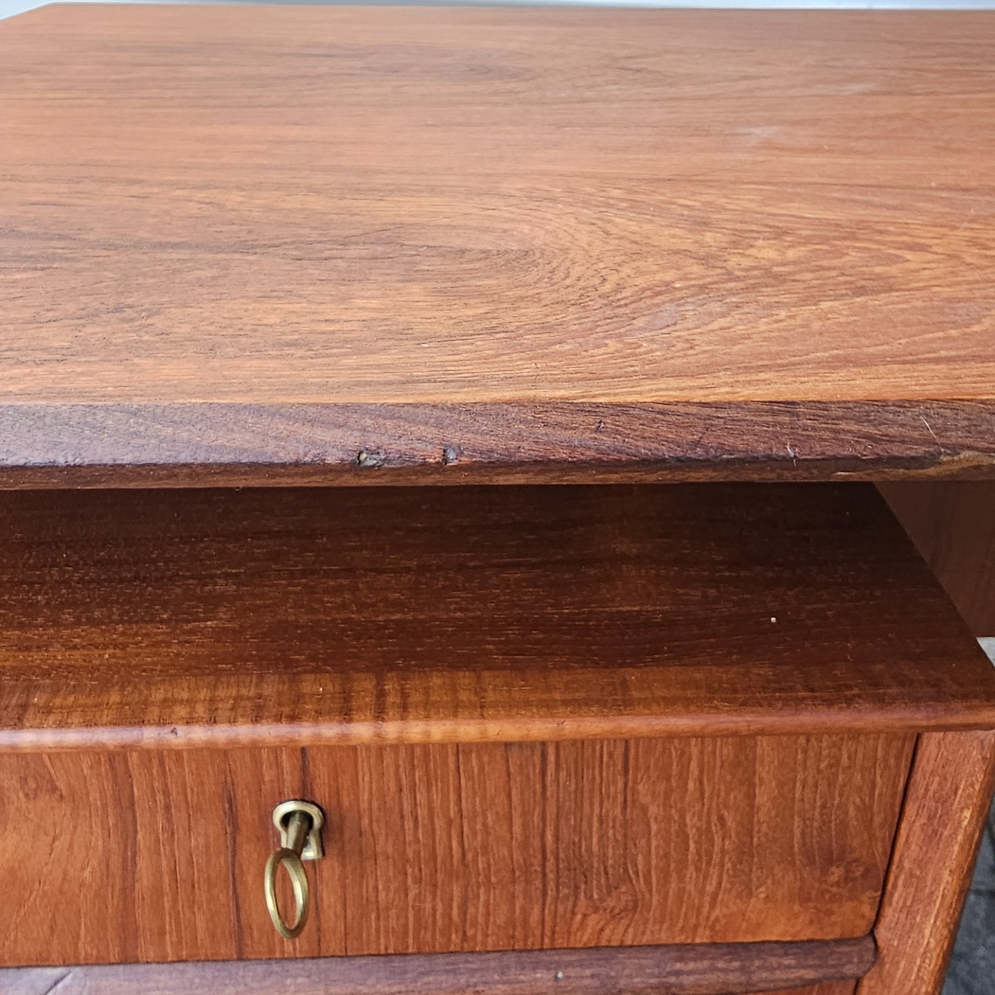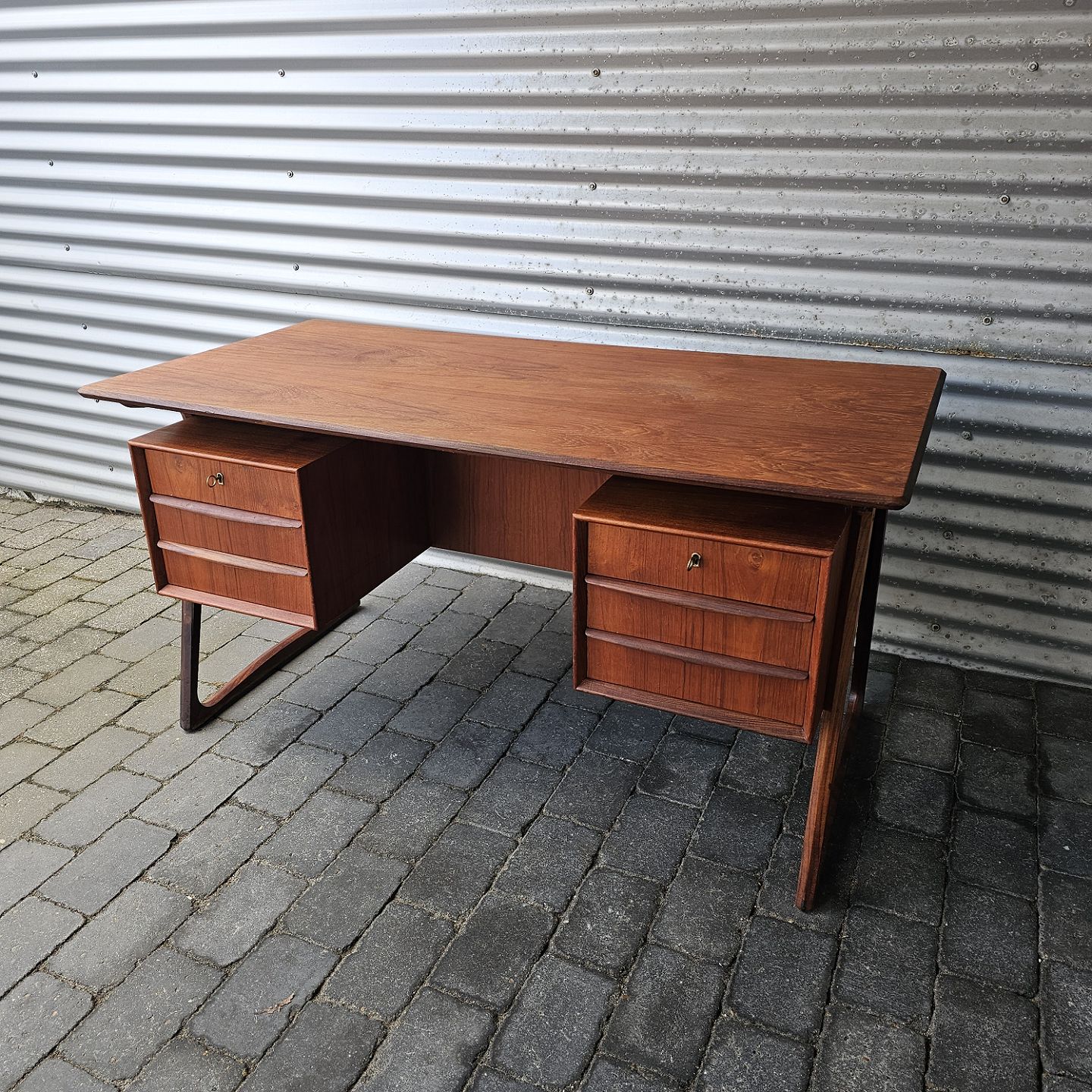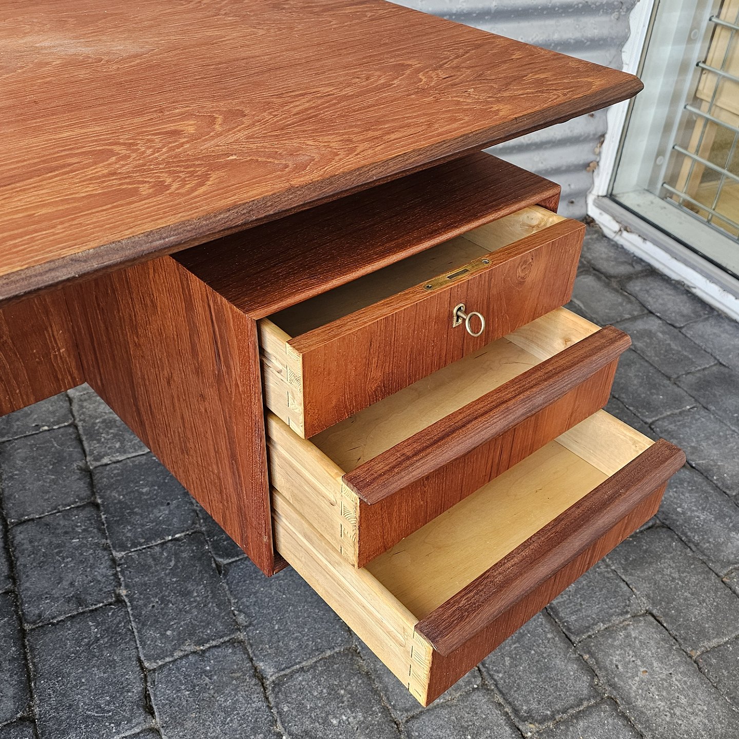 Skrivebord i teaktræ med skuffer i begge sider, øverste skuffer med nøgle