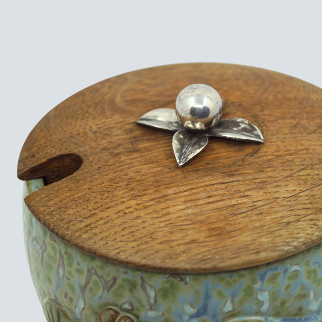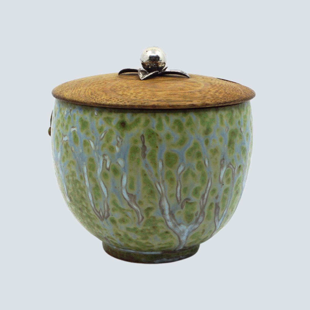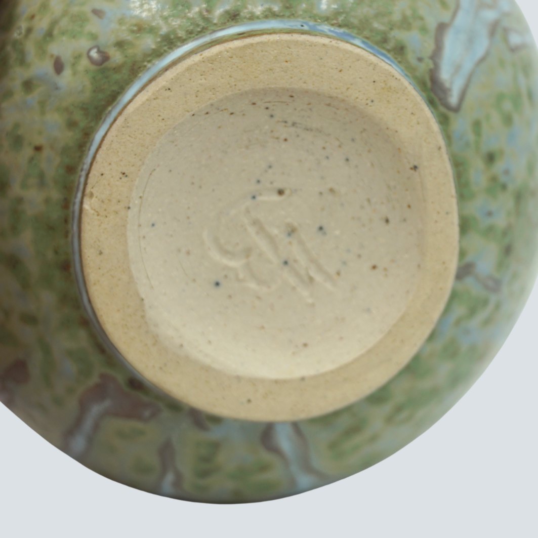 Arne Bang; Lågkrukke af stentøj med grøn og blå glasur. I god stand.