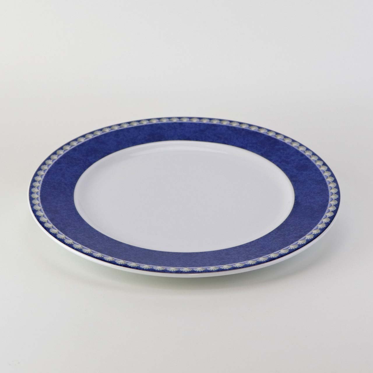 Service i glat hvid porcelæn med blåt bånd og dekoration af gule vifteformede strandskaller. Stellet kan gå i opvaskemaskinen.