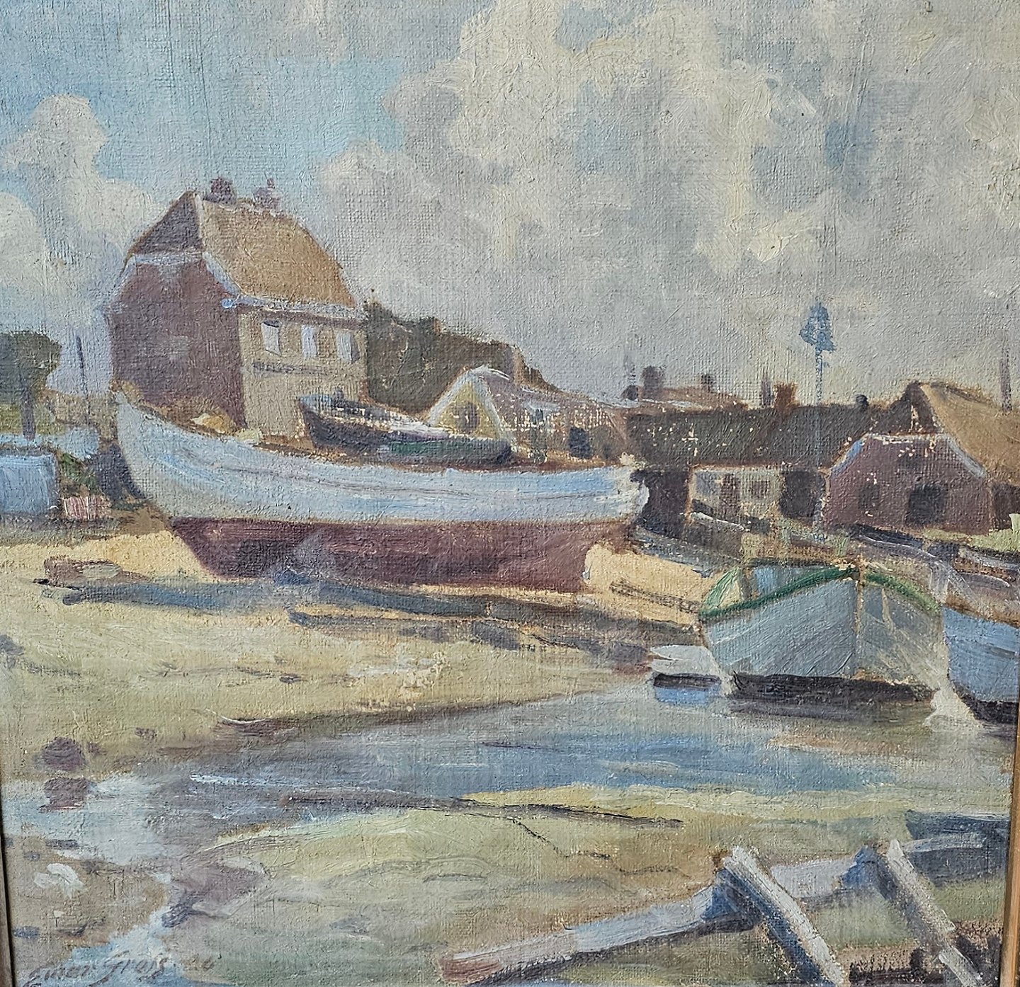 Oliemaleri på lærred monteret i guldramme med motiv af skibe på en strand