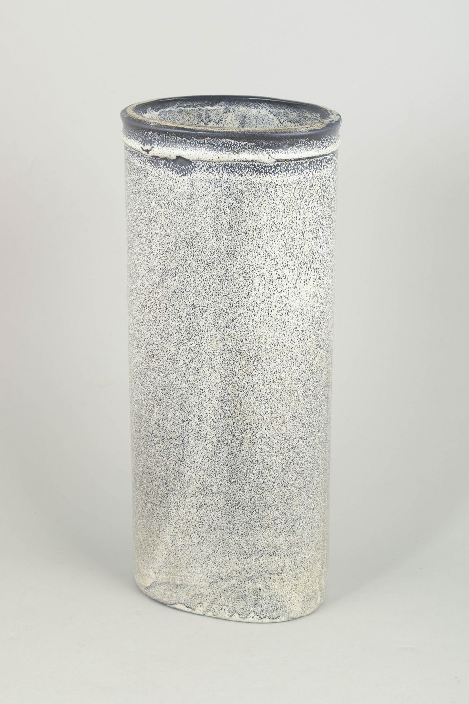 Stor vase i stentøj med cylindrisk form og karakteristisk dobbelt glasur i sorte og grå nuancer med levende, let krakeleret overflade. Et markant eksempel på Hammershøis monumentale formsprog og eksperimenterende glasurarbejde fra 1930’erne. Stemplet i bunden.