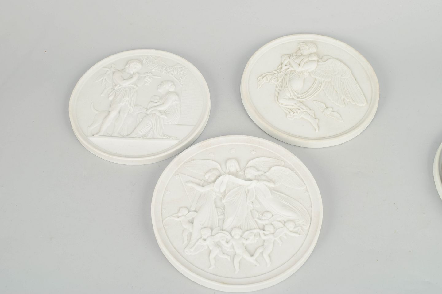 Relieffer i hvidt uglaseret porcelæn med klassiske motiver efter Bertel Thorvaldsen, udført i fin biscuit med detaljeret figurdekoration og ophæng på bagsiden. Første og tredje sortering.