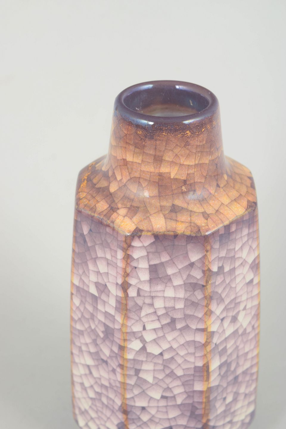 Dekorativ vase i stentøj med rillet overflade og lys glasur i creme og rosa nuancer. Formen er høj og let facetteret med en håndværksmæssig struktur, typisk for Marianne Starcks arbejde hos Michael Andersen & Søn. Stemplet i bunden.