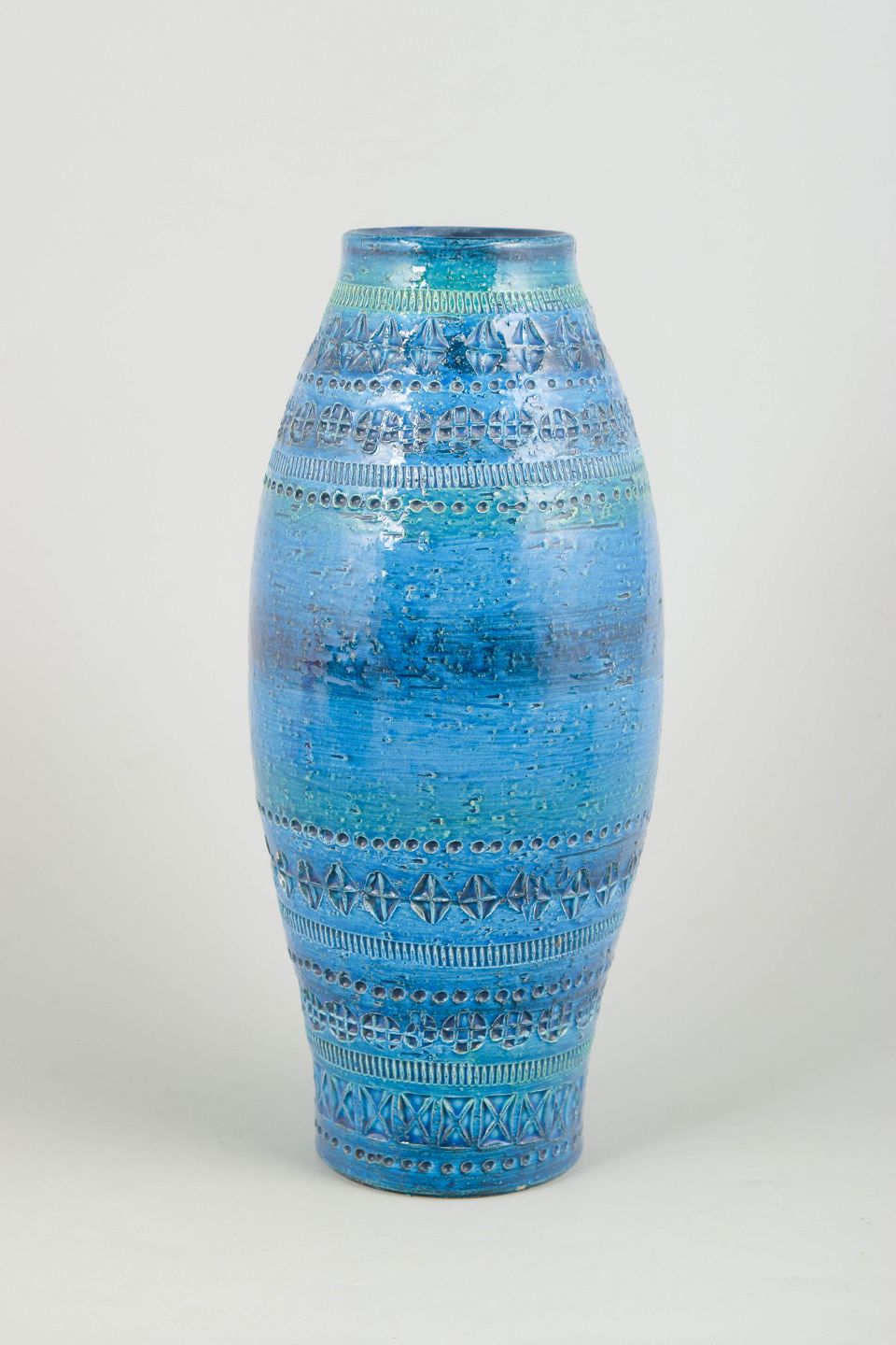 Stor dekorativ stentøjsvase med cylindrisk form og let tilspidset hals, udført med karakteristisk riflet struktur og glasur i nuancer af blå og turkis med subtile variationer.